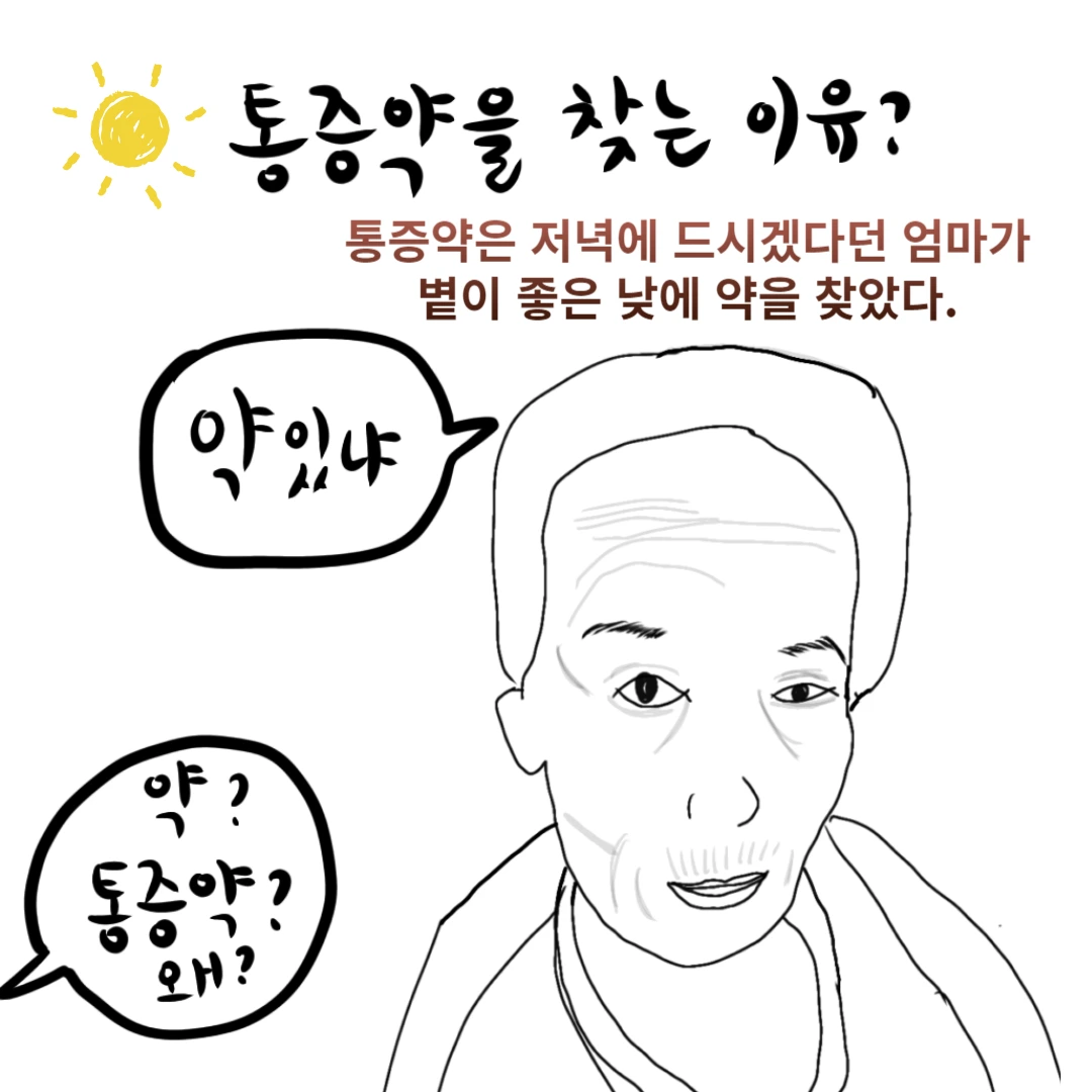 엄마는 매일 통증약을 드셔야만 한다. 오늘도 통증약을 찾으셨다. 아침에 한알 저녁에 한알 드시기도 하시고 아침 점심 저녁마다 드시기도 하신다. 어쩔땐 한밤중에 일어나 약을 찾기도 한다. 엄마의 통증의 강도가 얼마정도인지 판가름하기도 힘들다. 그러다가도 정말 심한 통증은 잘 참아내시는 분이시다.