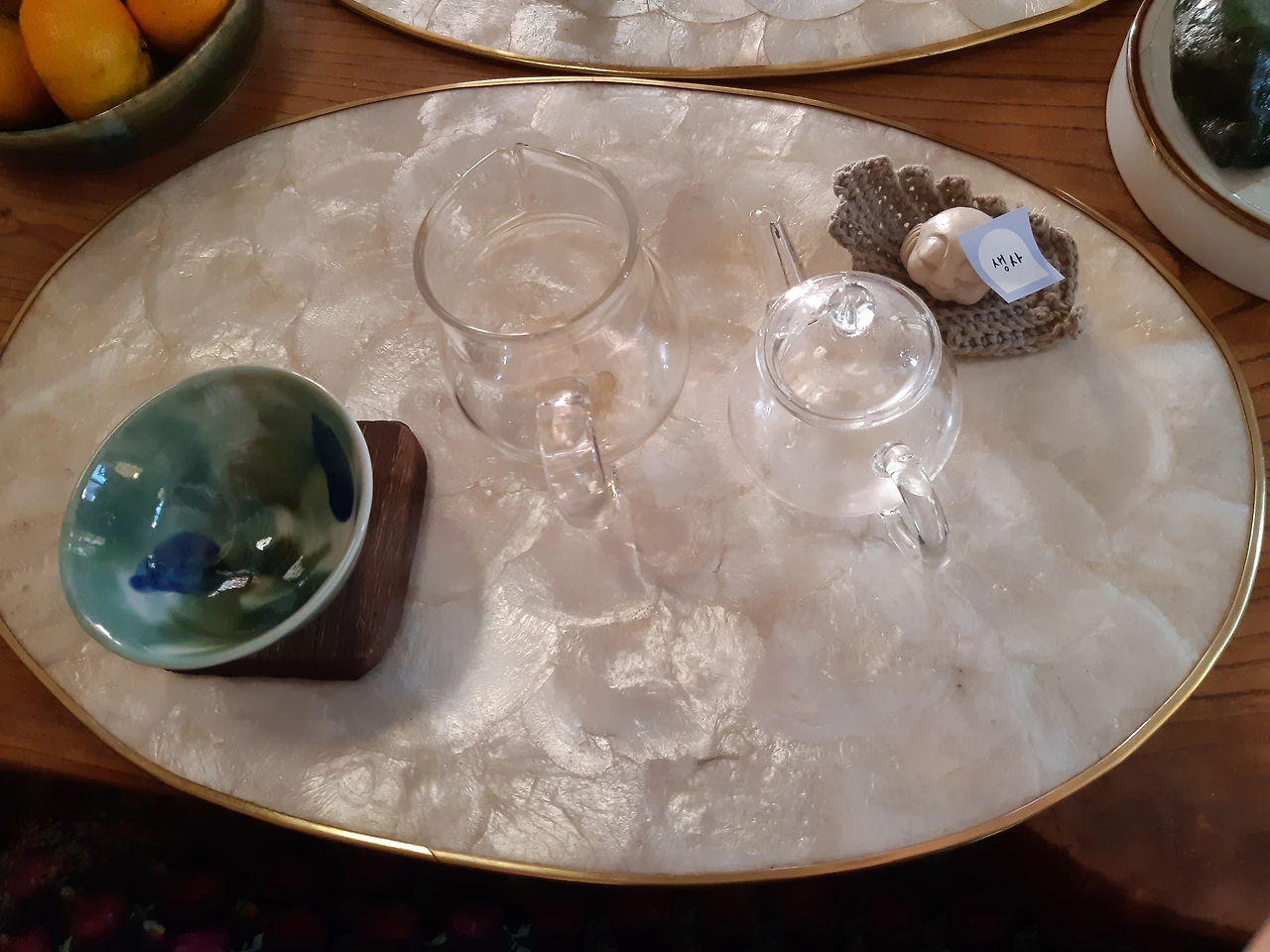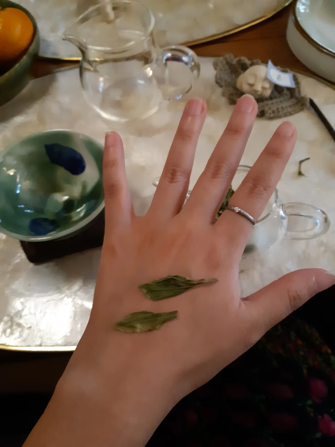 송나 님께서 이끄는 다도체험을 오감을 사용하는 시간이었다. 밖에서 졸졸졸 흐르는 물소리와 다도를 하며 물이 이리저리 오가는 소리를 들었다. 마른 녹차 잎을 씹어 먹어보기도 했는데, 녹차의 풍미가 느껴졌다. 찻주전자에 풀어진 녹차 잎을 보았다. 자그마한 어항을 들여다보는 기분이었다. 어떤 잎은 수면에 떠있고, 어떤 잎은 가라앉아 있었다. 어떤 잎은 물 중간에 세로로 떠있었는데, 해마 같았다. 차의 맛과 향을 음미했다. 나중에는 핀셋으로 녹차 잎 몇 개를 꺼내어 손등에 올려 펴보기도 했다. 녹차로 타투를 받는 것 같았다.