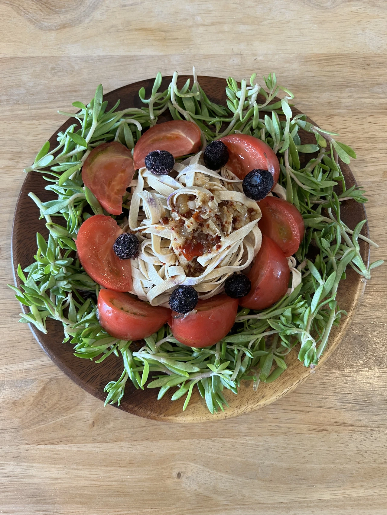 (또) 엄마가 준 두부면으로 간단히 식사를 해 먹어 봤는데 성공적이어서 종종 해 먹는다. 집에 있는 재료로 발사믹 소스 비슷하게 만들어 집에 있는 채소와 과일을 곁들여 먹는데, 덕분에 냉동 블루베리도 추가됐다.