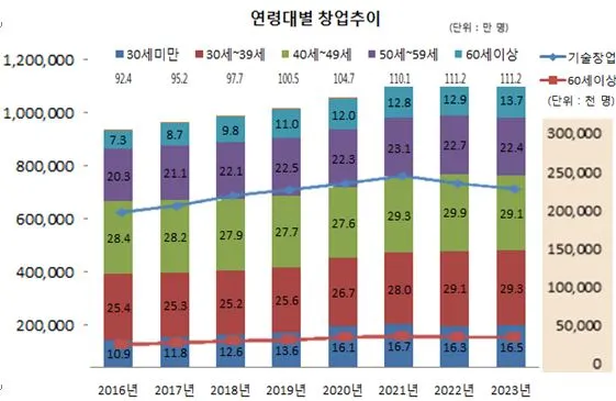 2023년 부동산을 제외한 순수 창업 수는 1,111,932개이며, 기술창업이 221,436개로 구성비가 20% 점유. 경기 불안으로 창업은 최근 3년간 횡보하고 있지만 60세 이상 창업은 꾸준히 늘고 있으며, 특히 2016년 대비중기적으로는 타 연령대 대비 일반 창업과 기술창업 모두 증가율이 월등히 높게 나타나고 있다.
