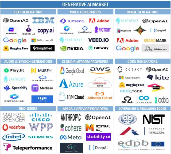 이들 기술과 서비스의 수요기업은 새로운 제품 및 서비스 개발, 마케팅, 고객 서비스, 운영 등 비즈니스 프로세스 개선, 생산성 향상, 비용 절감, 새로운 수익 창출 등에서 기회를 모색하는 기업들이다. 수요 산업으로는 미디어 및 엔터테인먼트, 소매 및 전자상거래, 금융 서비스, 의료, 제조, 물류, 농업 등 전 산업분야이다. 참여 기업과 성과를 내고 있는 기업들이 늘어나 경쟁도 치열해지면서 생성 AI의 산업계 지도도 확장되고, 재조정되면서 진화되고 있다.