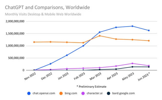 PC와 모바일을 통한 방문자 수의 추이이다. 2022년 11월 출시 후 5일 만에 최단기간 100만 명 가입 돌파(최초 기록은 2023년 Threads로 변경), 2023.01월 1억 명 돌파, 2024.05월 1.8억 명을 돌파했다. GPT-4o 발표 이후는 ChatGPT의 일일 트래픽이 1억 방문, 5월에 20억 방문을 넘었다.