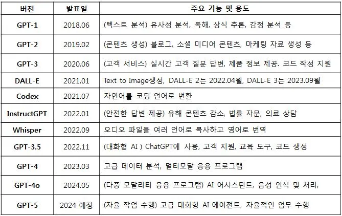 챗봇(ChatGPT/Plus/Pro), 이미지 생성(DALL-E 3), 동영상 생성(Sora), 멀티모달(GPT-4.o) 등 단계적이지만 초고속으로 신기술과 새로운 서비스를 지속적으로 내놓고 있는 중이다.