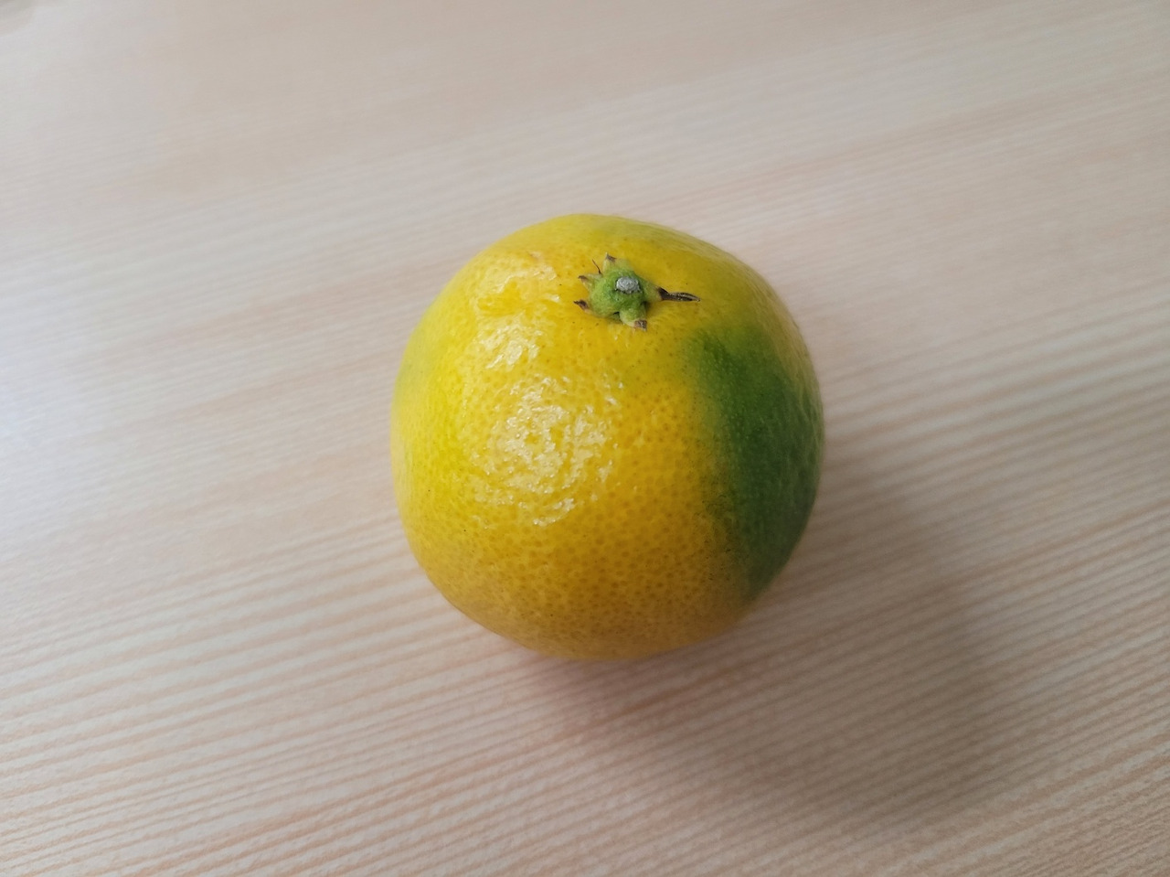 주황색의 바탕에 초록 얼룩이 있는 귤이네요.