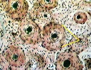 뼈를 구성하는 가장 작은 구조를 골원(Osteon)이라고 하는데 그림에서 동그라미들이 여러 개로
