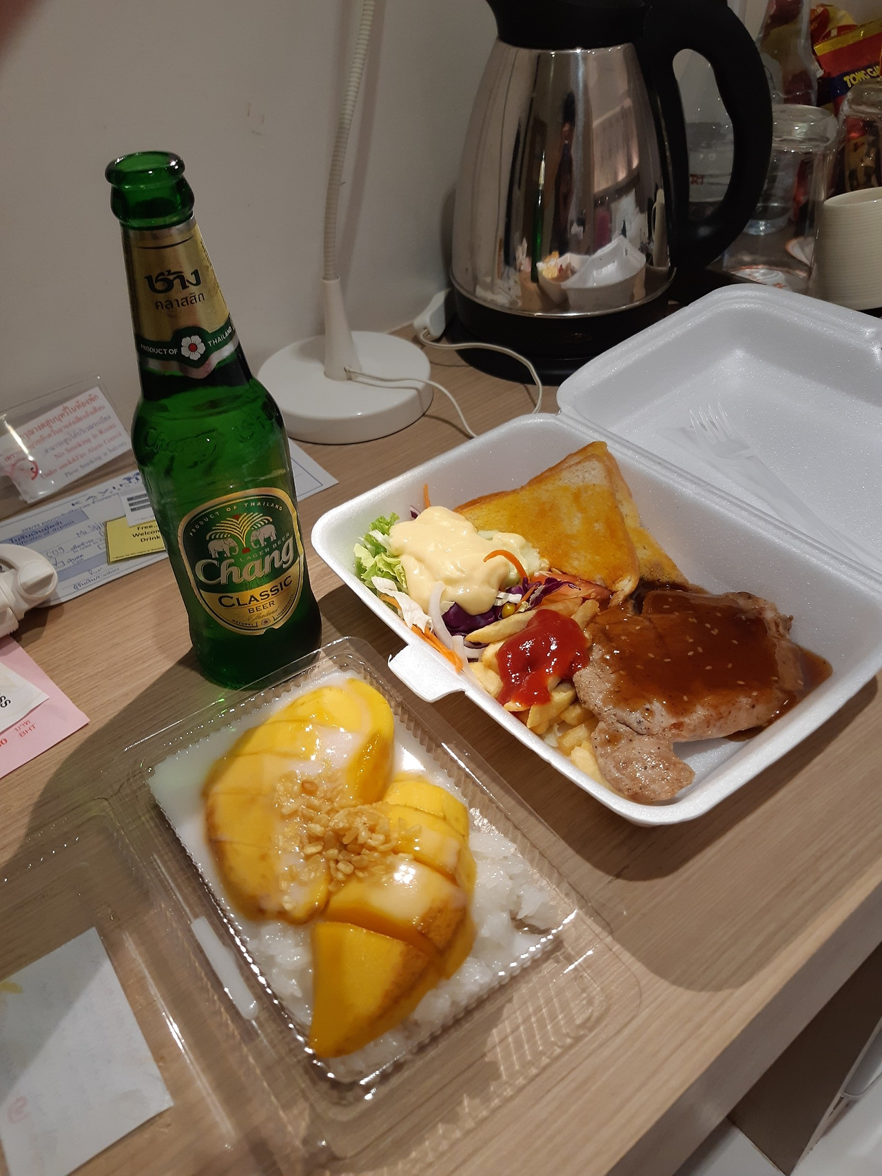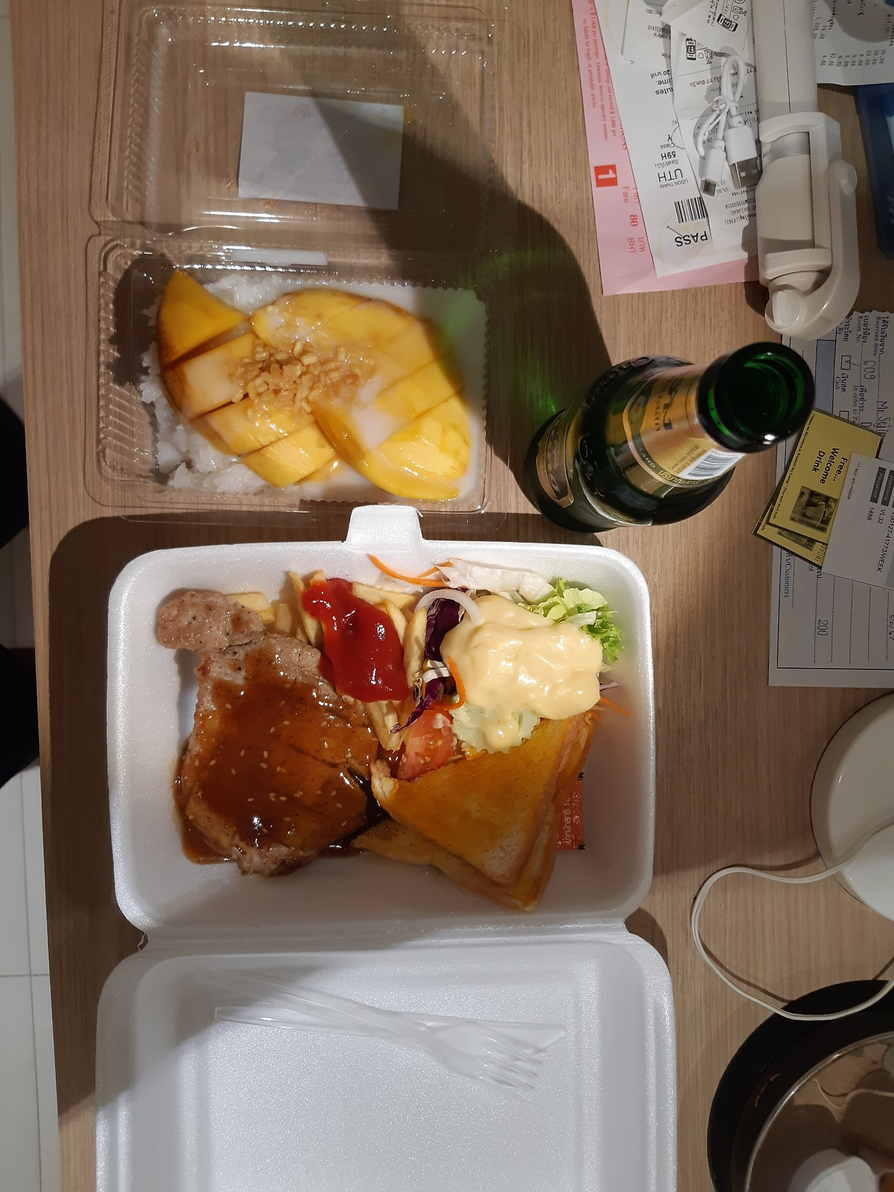 방콕 돈므앙 공항에서 우돈타니로 가는 환승 항공편을 기다리는 동안, 나는 배가 너무 고파서 공항 내 식당을 두리번 거리다, 예전 태국 여행 때 맛있게 먹었던 망고밥이 생각나 망고밥을 파는 식당에 자리잡았다. 그러나, 맛이 형편없었다. 망고+연유의 조합인데 이게 맛이 없을 수 있다는 사실에 놀라움을 금치 못했다.