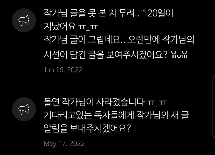 진짜 내 글을 기다리고 있는 사람이 있는 것 같아서 당장이라도 글을 써내야 할 것 같은 압박감이 생긴다.