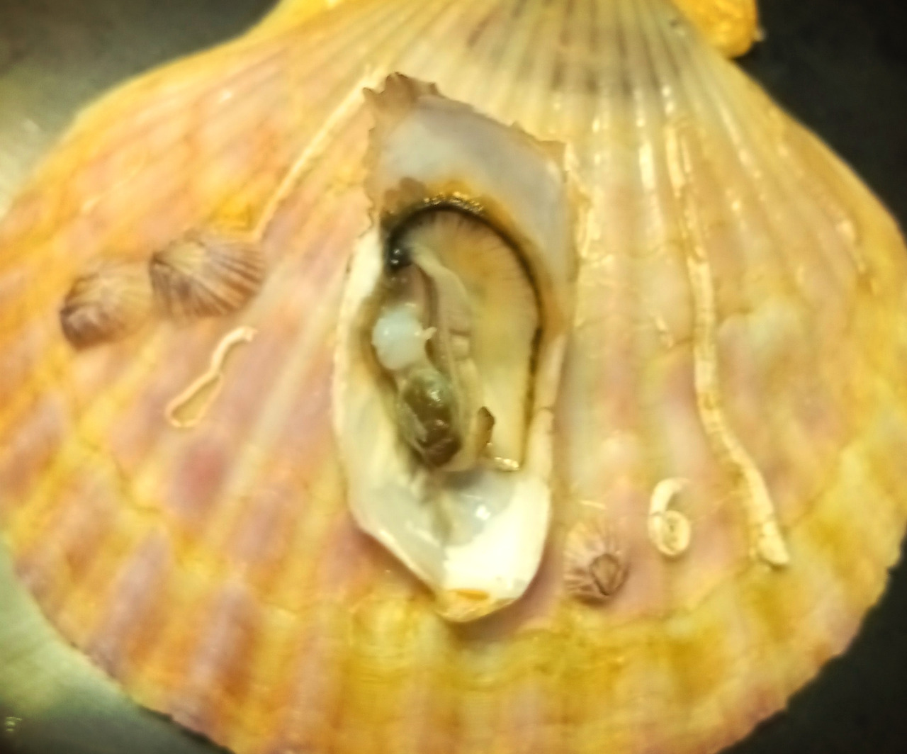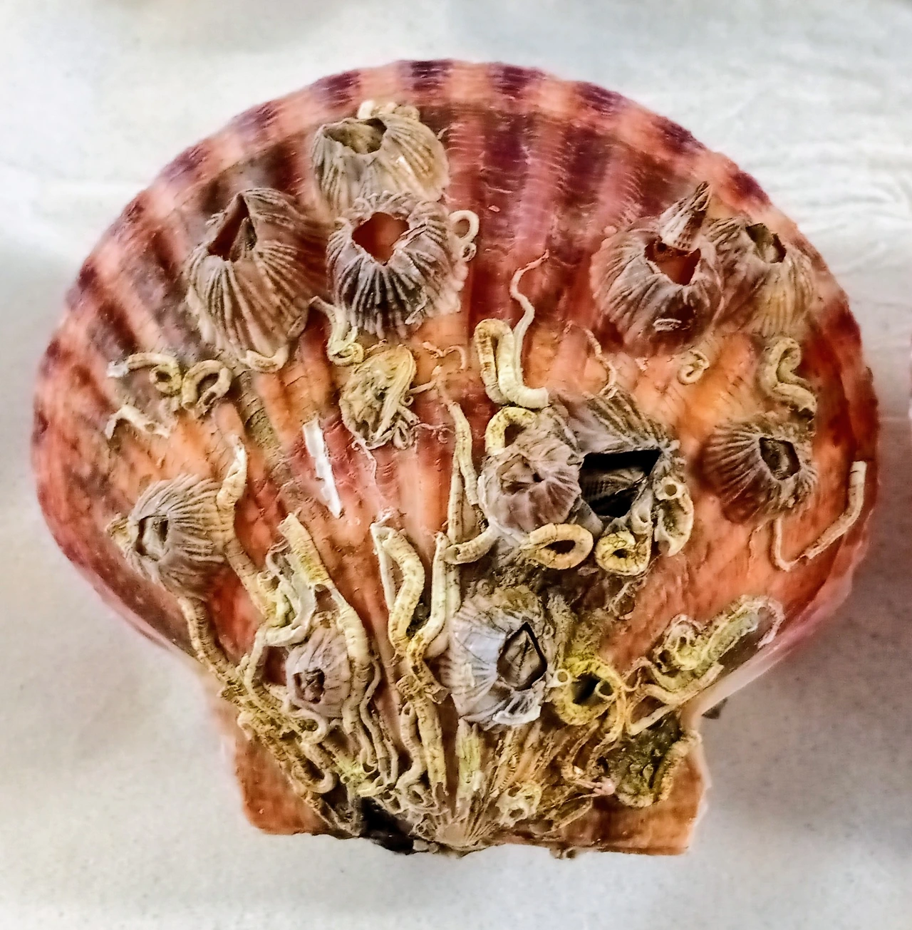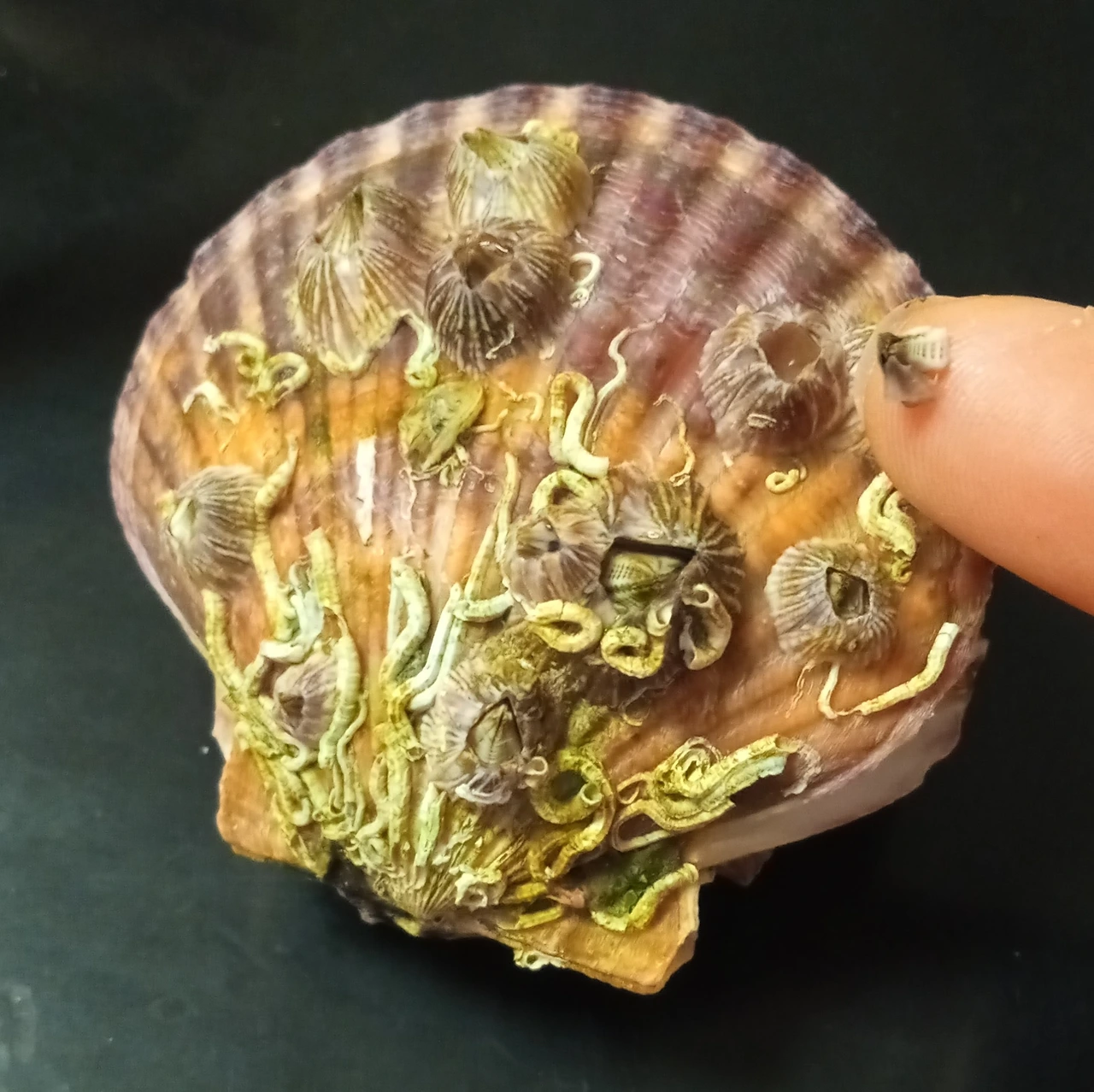 런데 자세히 보니 이 기지 안에 무언가 있다. 그냥 가리비에 이물질이 붙어 있는 거라고 생각하고 무심하게 지나쳤는데 생물이 기생하고 있었다. 아쉽지만 모두 죽어있었다. 자세한 생김이 궁금해졌다.