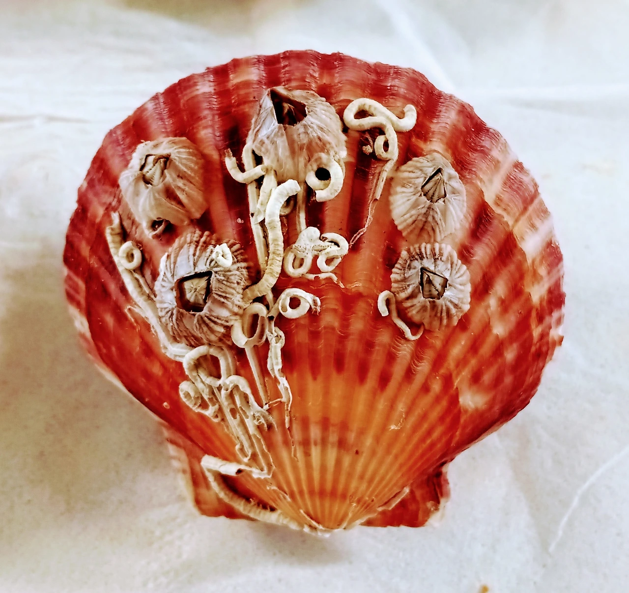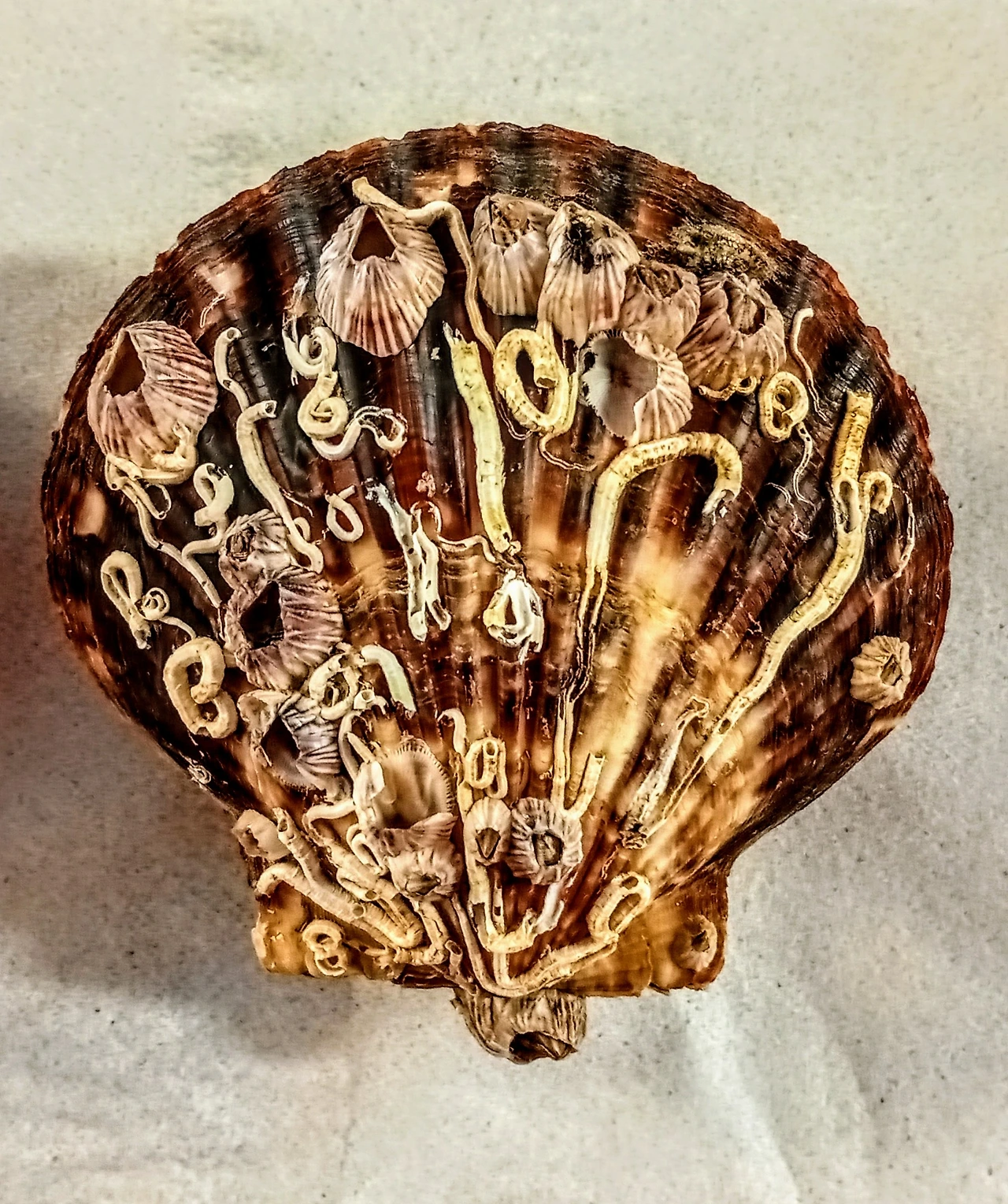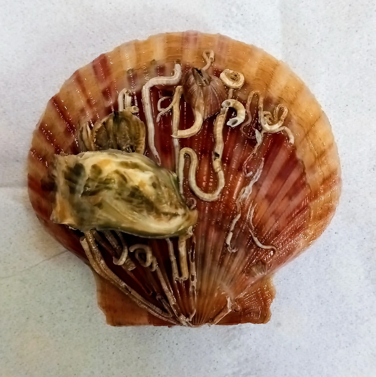 런데 자세히 보니 이 기지 안에 무언가 있다. 그냥 가리비에 이물질이 붙어 있는 거라고 생각하고 무심하게 지나쳤는데 생물이 기생하고 있었다. 아쉽지만 모두 죽어있었다. 자세한 생김이 궁금해졌다.