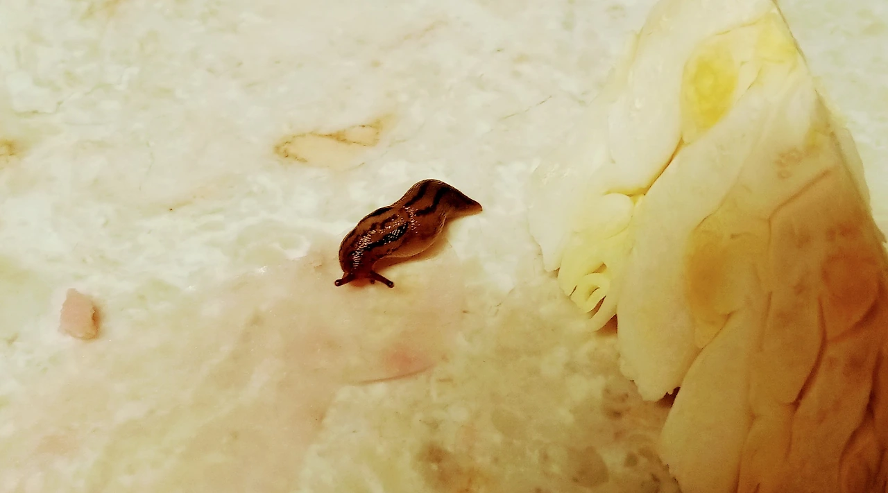 상추에서 나온 민달팽이다. 양배추와 소시지를 양 옆에 두고 어디로 가나 봤는데 소시지 껍질로 갔다. 이녀석을 양배추 쪼가리에 붙여 두었는데 잠시 한눈 판 사이에 사라지고 말았다.