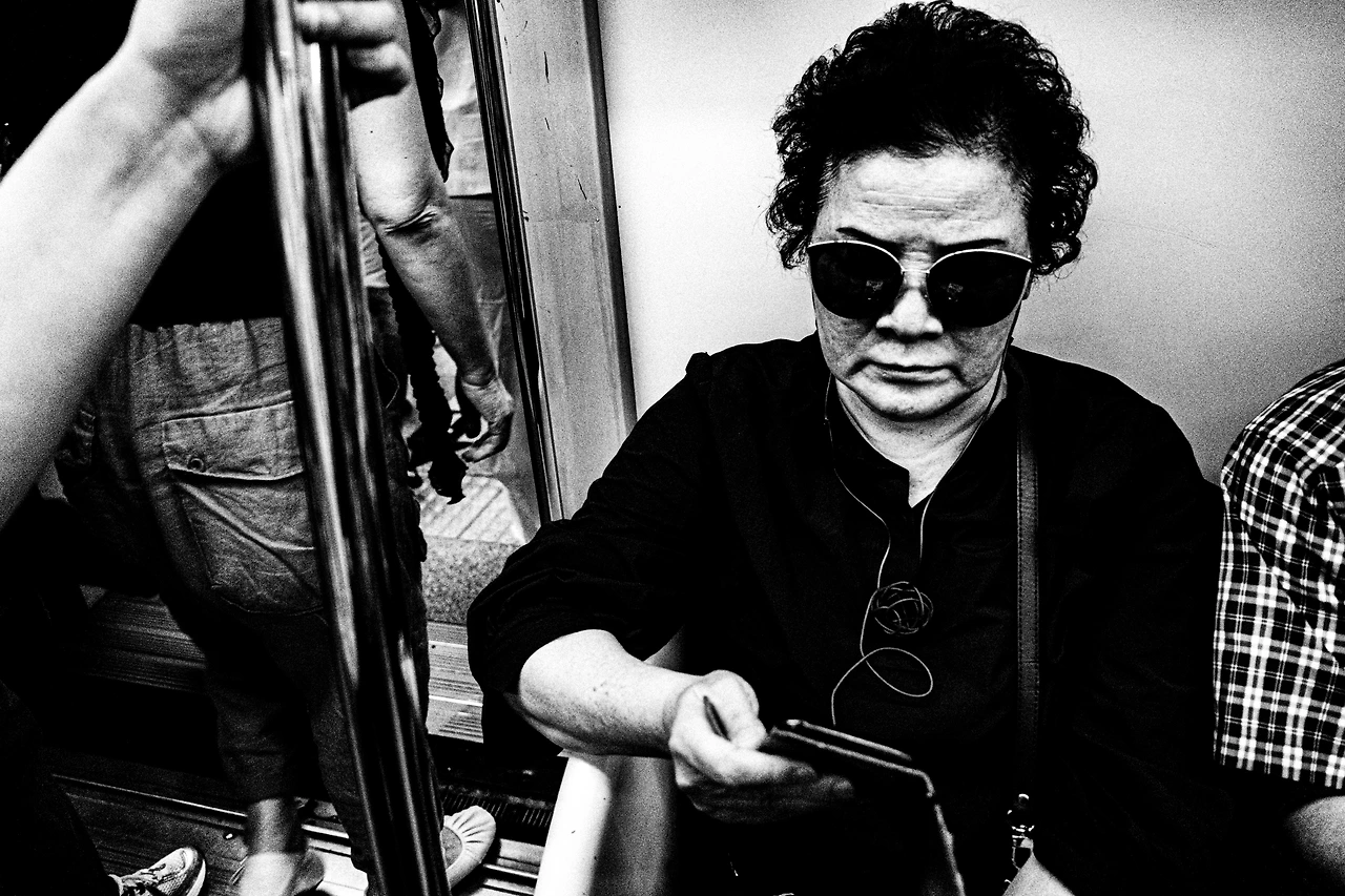 지하철 안, 한 여인이 짙은 선글라스를 끼고 앉아 있다. 그녀의 손에는 스마트폰이 들려 있고, 얼굴에는 표정이 없다. 하지만 무표정 속에 담긴 것은 공허가 아니라 깊이다. 마치 오랜 시간 축적된 무언가가 그 작은 화면과 검은 렌즈 사이에서 응축되어 있는 것처럼.