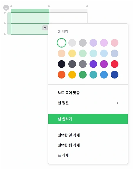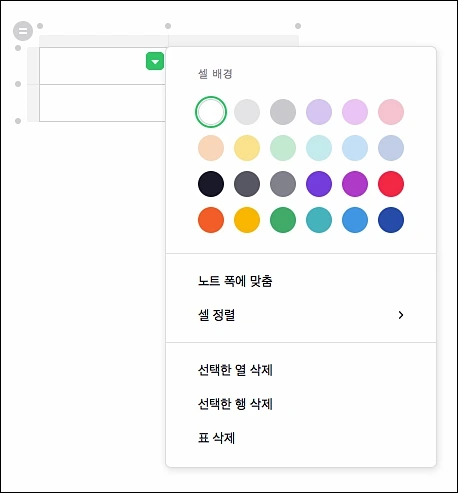 셀에 배경색을 넣을 수 있는 '셀 배경', '노트 폭에 맞춤', '셀 정렬', '선택한 열(행) 삭제', '표 삭제' 등등 다양한 기능이 있네요. 그런데 이 기능들이 끝이 아니라는거. 숨은 기능은 아래서 설명을 하도록 하겠습니다.