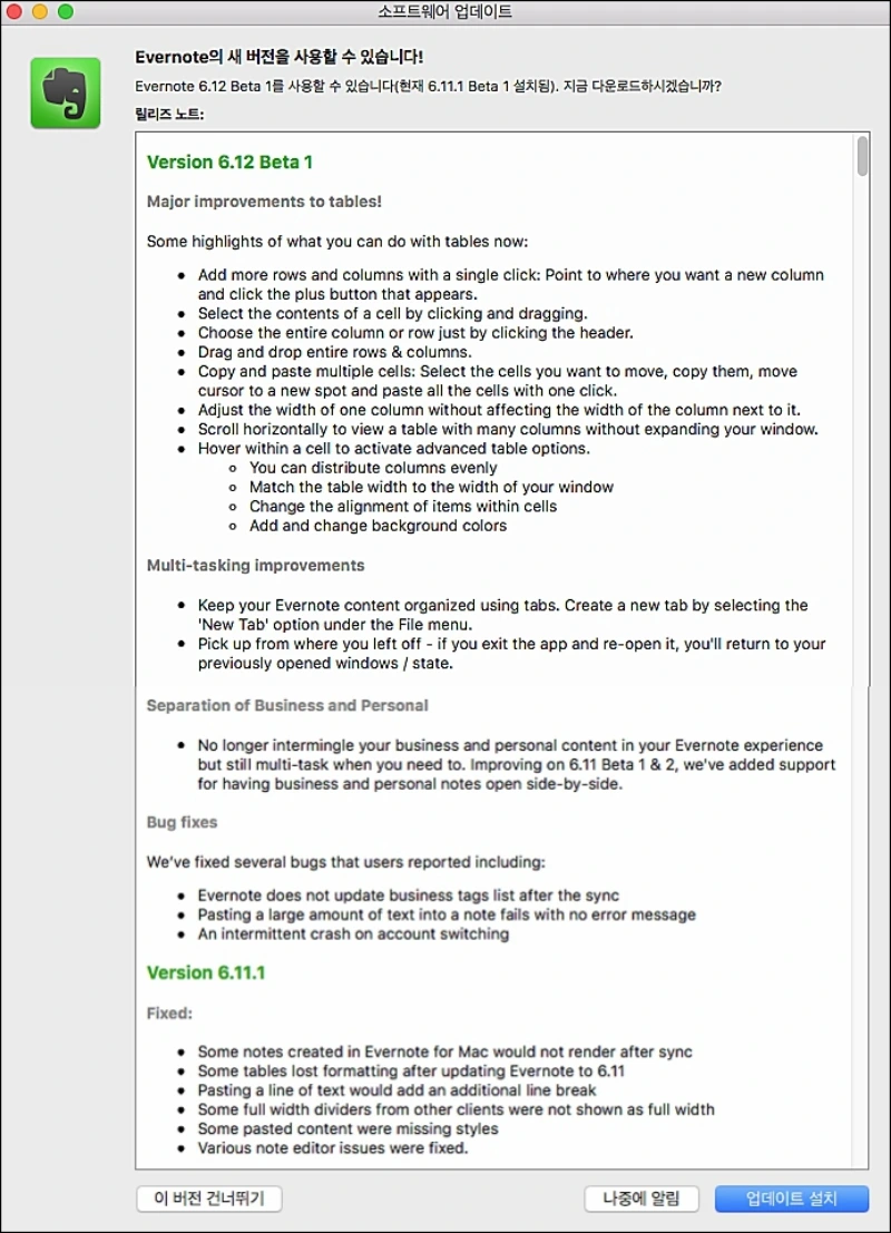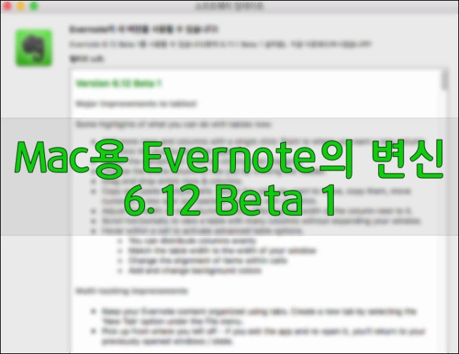 오랜만에 ECC로써 에버노트에 관한 포스팅을 합니다. 오늘 포스팅 할 릴리즈 내용은 정식 버전이 아닌 베타 입니다. 맥용 evernote 정식 버전은 현재 6.11 입니다.