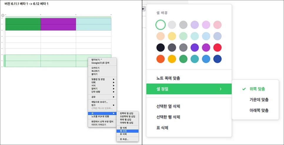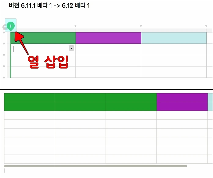이전 버전에서 행 또는 열을 삽입하기 위해서는 마우스 우클릭을 한 다음에 행 또는 열을 삽입 했어야 했는데 이제는 표 좌측과 위에 위치하고 있는 '+'를 클릭해서 삽입을 할 수 있게 되었습니다. 하지만 이 부분에서 불편한 점도 있습니다. 이전 버전에서 행 또는 열을 삽입 할 때는 셀에 색이 있어도 추가가 되는 행 또는 열에 색에 대한 영향을 미치지 않았는데 이번 6.12 베타 1 버전에서는 배경색이 있는 셀 주위에 행(열)을 삽입 하면 똑같이 복사가 된다는 점.