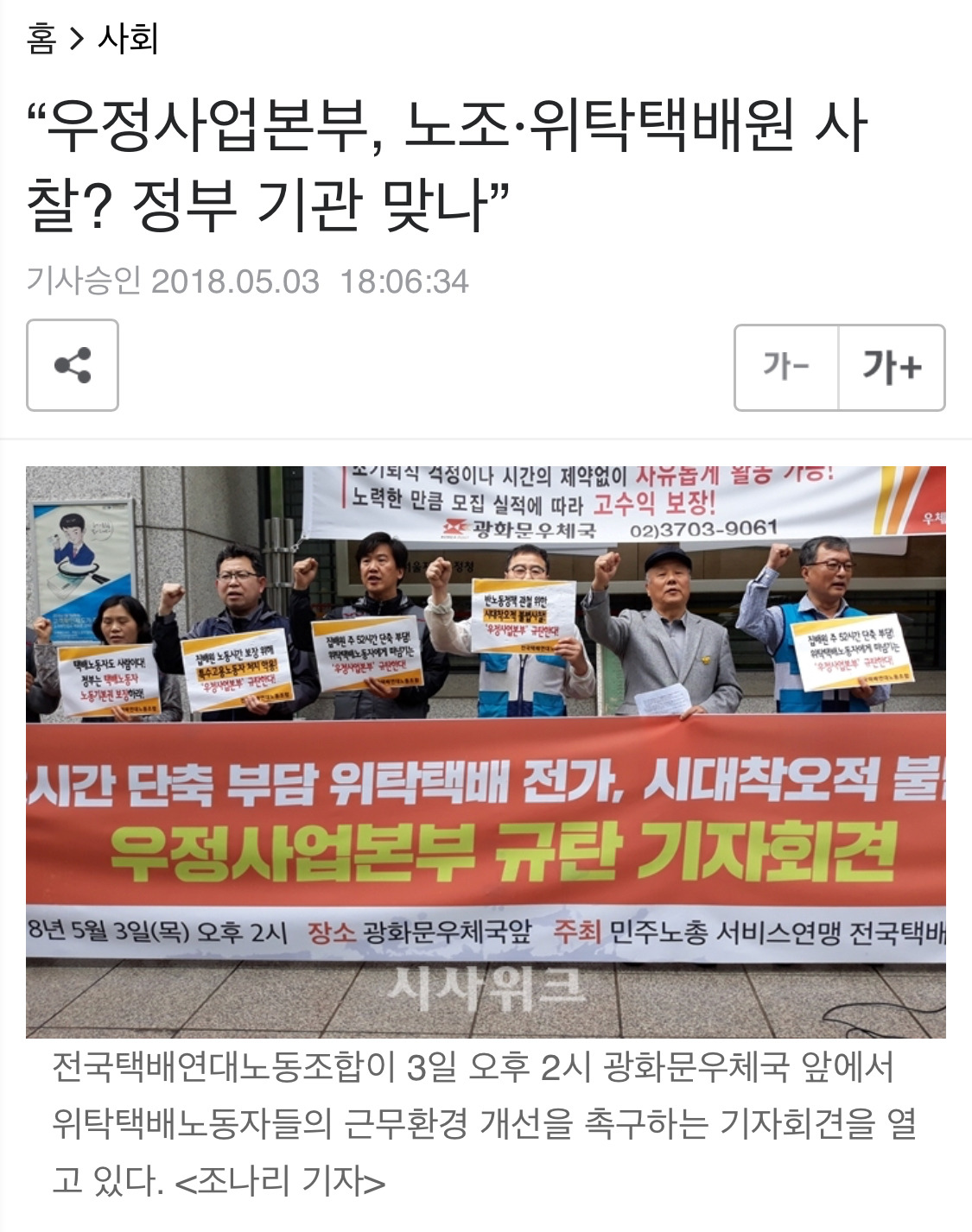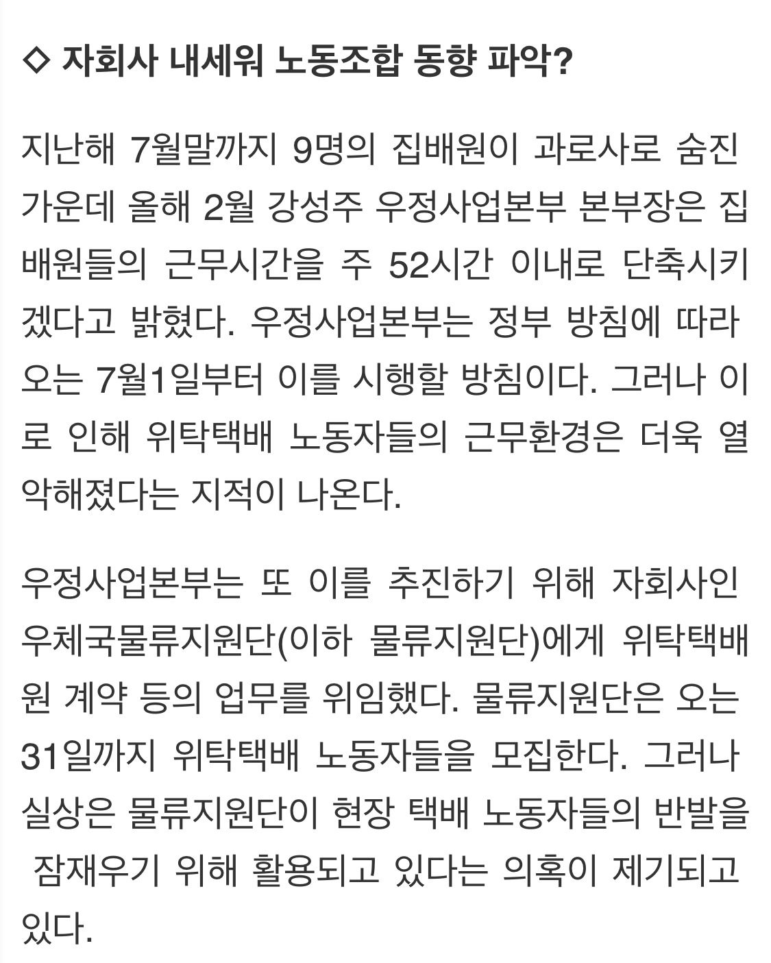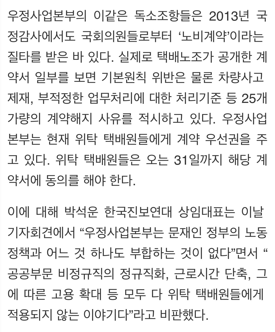 우체국 로고가 박힌 유니폼을 입고 일하지만정당한 대우는 받지 못하는 노동자들이 있습니다여러분이 빠르고 친절하게 배송받는 우체국택배 위탁배달원들의 이야기입니다노동권을 존중하려는 정권과 다르게 국가기관인 우정사업본부는 오히려 위탁배달원들을 쥐어짜는 갑질의 횡포로 역행하고 있습니다투쟁중인 전국의 우체국택배 위탁배달원들의 목소리에 귀 기울여주세요