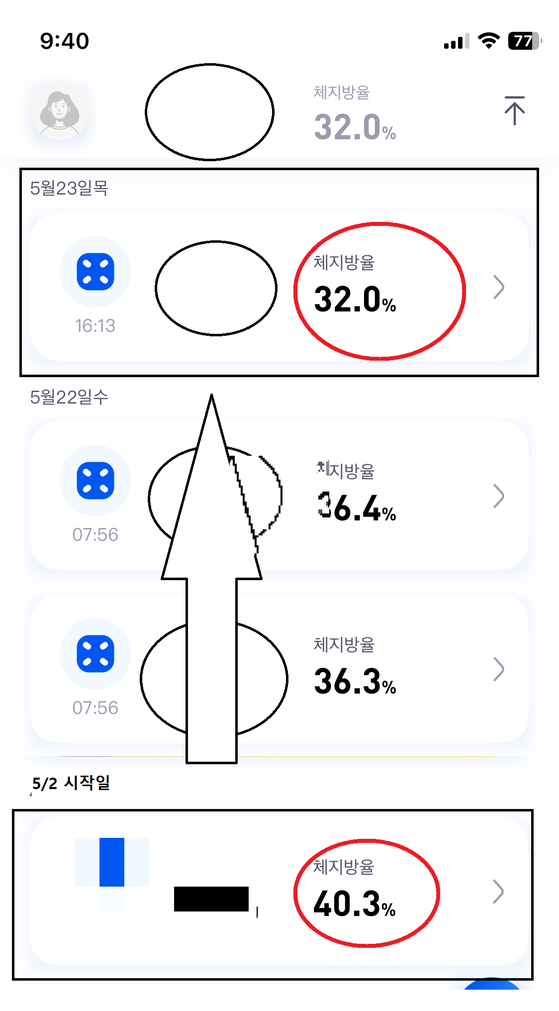 5월 2일(목) 체지방률 40%였는데- 지금 32%로 확 줄었다! 일시적인 현상이라도 놀라운 수치였다. (이후 다음날 쟀을때도 33-34%였다. 체지방이 이렇게 빠지다니! 이건 기적이야!