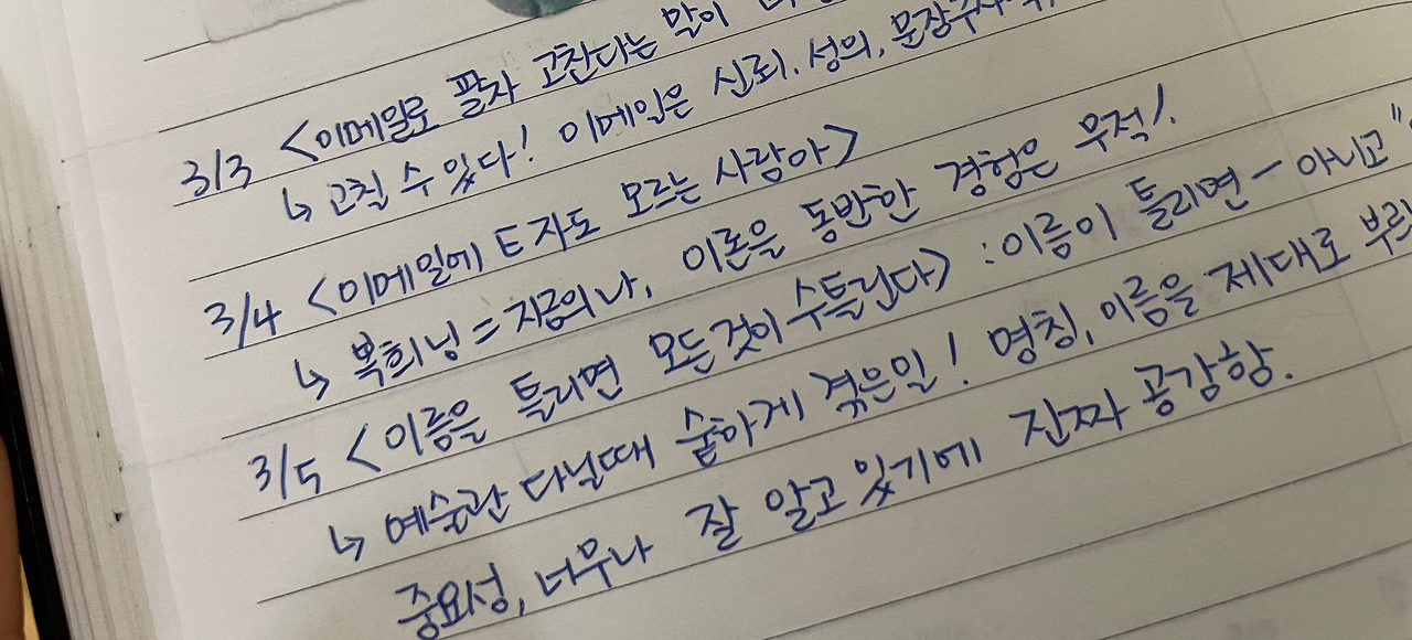 나는 계획표를 새로 짰다. 월-금 <일간 이슬아> 읽고 한줄 감상문 쓰기 / 매주 화요일은 방송 원고 마감 / 2,4주 차글차글 / 목요일 오전은 녹음 / 주2회 줌바는 3회로 변경 / 주2회 그룹운동