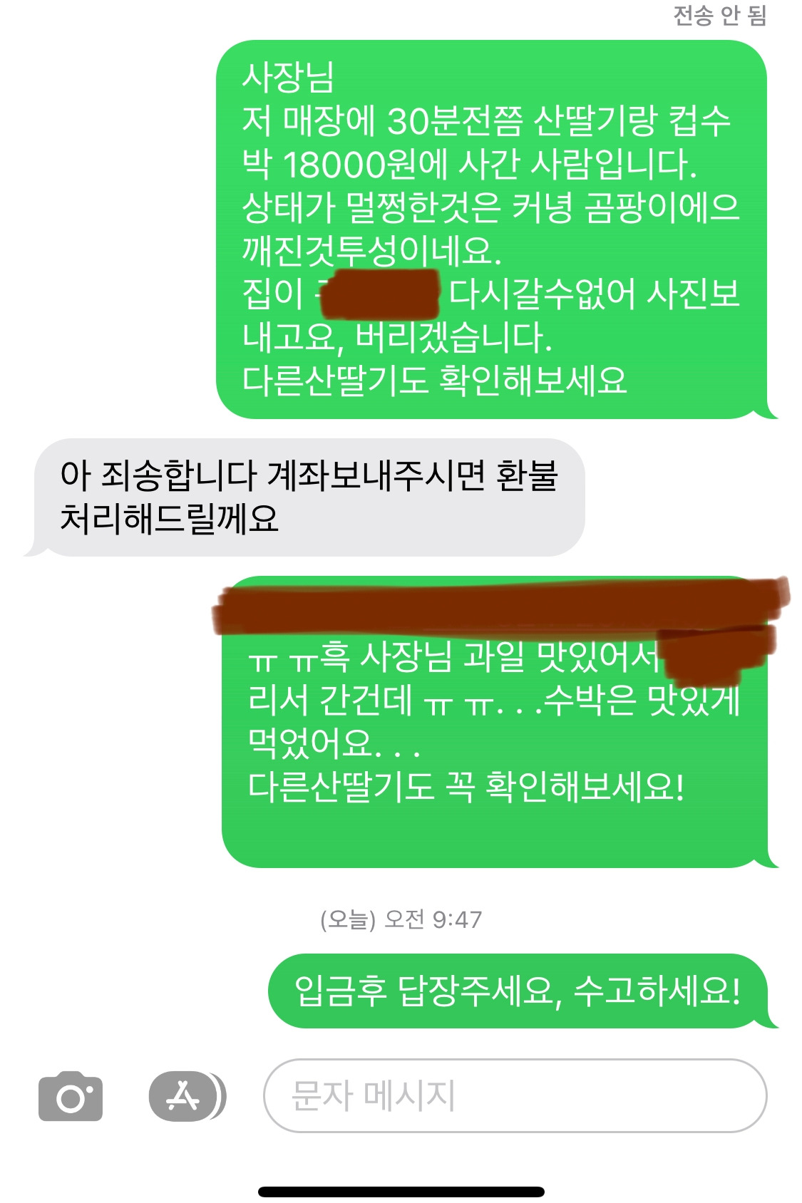 이런 쓰레기를 좋다고 받아온게 한심하기도 하고, 산딸기 하나 살거라고 몇 시간 발품 판게 너무 억울했다. 가게에 다시 가서 주고 오자니 왔다갔다 기름값이 더들겠다 싶었다. 맥이 탁 풀렸지만 가게 주인에게 문자를 보냈다. 이윽고 답장이 왔다. 군더더기 없는 주인의 답장에 기분이 풀렸다. (아직 입금은 되지 않았다. 돈은 애초에 환불을 바라진 않아서 더 재촉하지 않기로 했다.)
