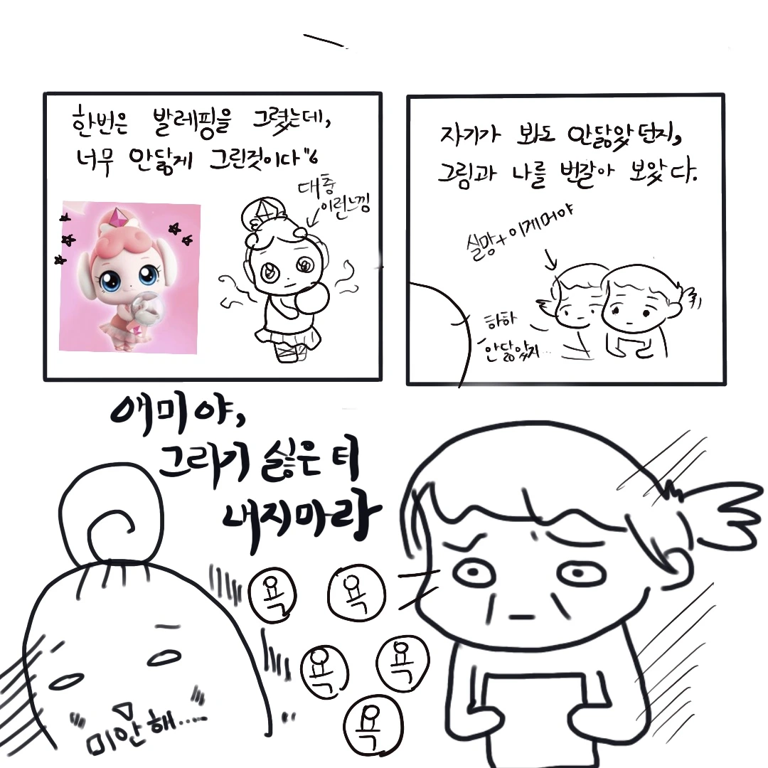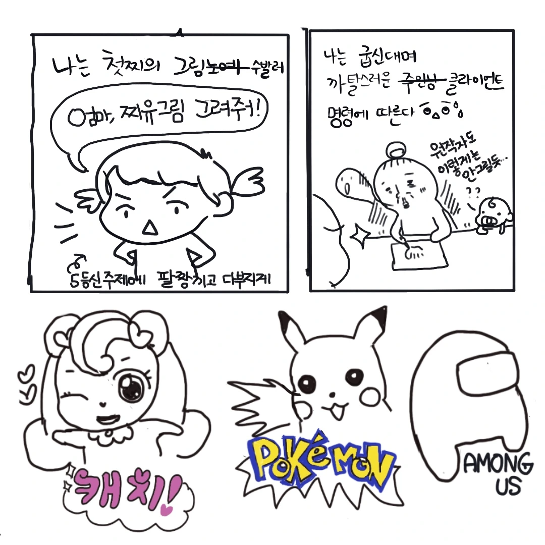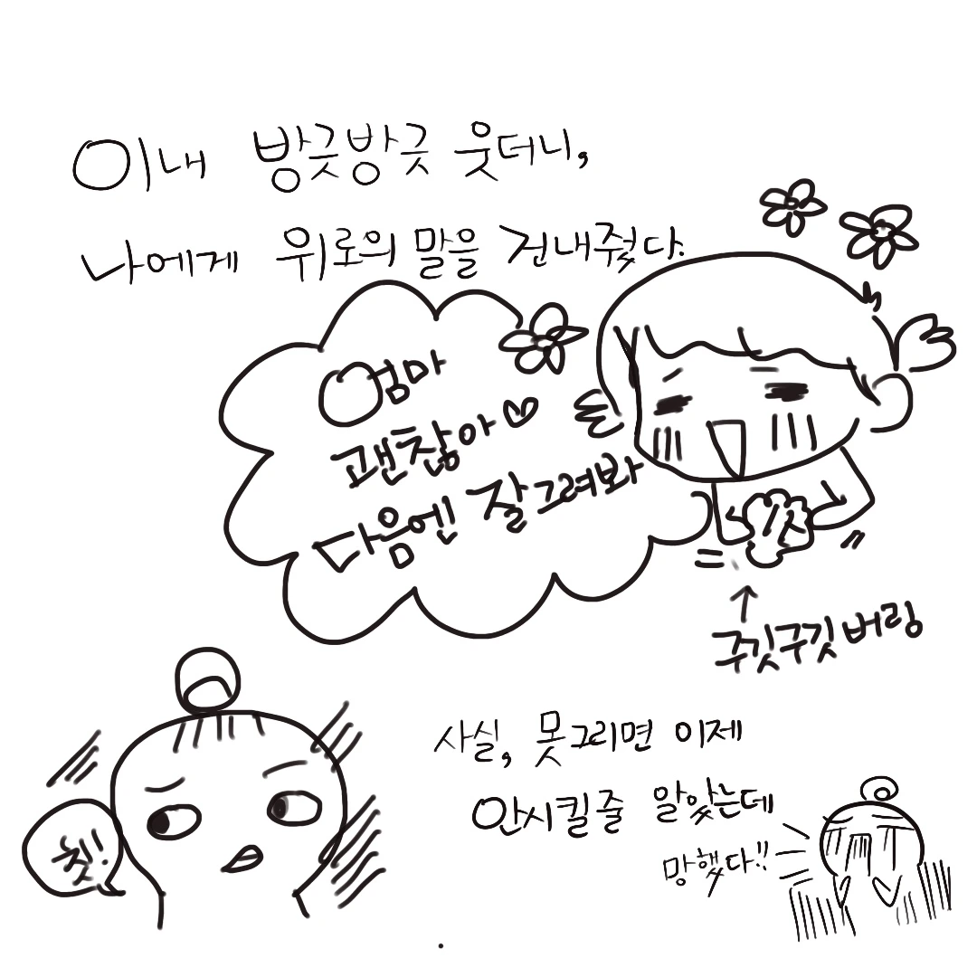 내가 볼 땐, 예쁘게 프린트 된 색칠놀이들이 훨 좋아보이는데, 첫찌는 매번 '엄마가 그려준게 더 죠아!엄마가 더 좋아서 그리라고 하는거란 말이야!" 라고 화를 내면서 날 조종한다. 난 첫찌에게 가스라이팅 당하고 있다...오늘도 난 안 닮은 그림을 그렸고, 첫찌는 힘내라고 어깨를 토닥여 줬다.