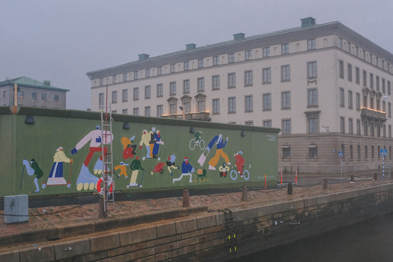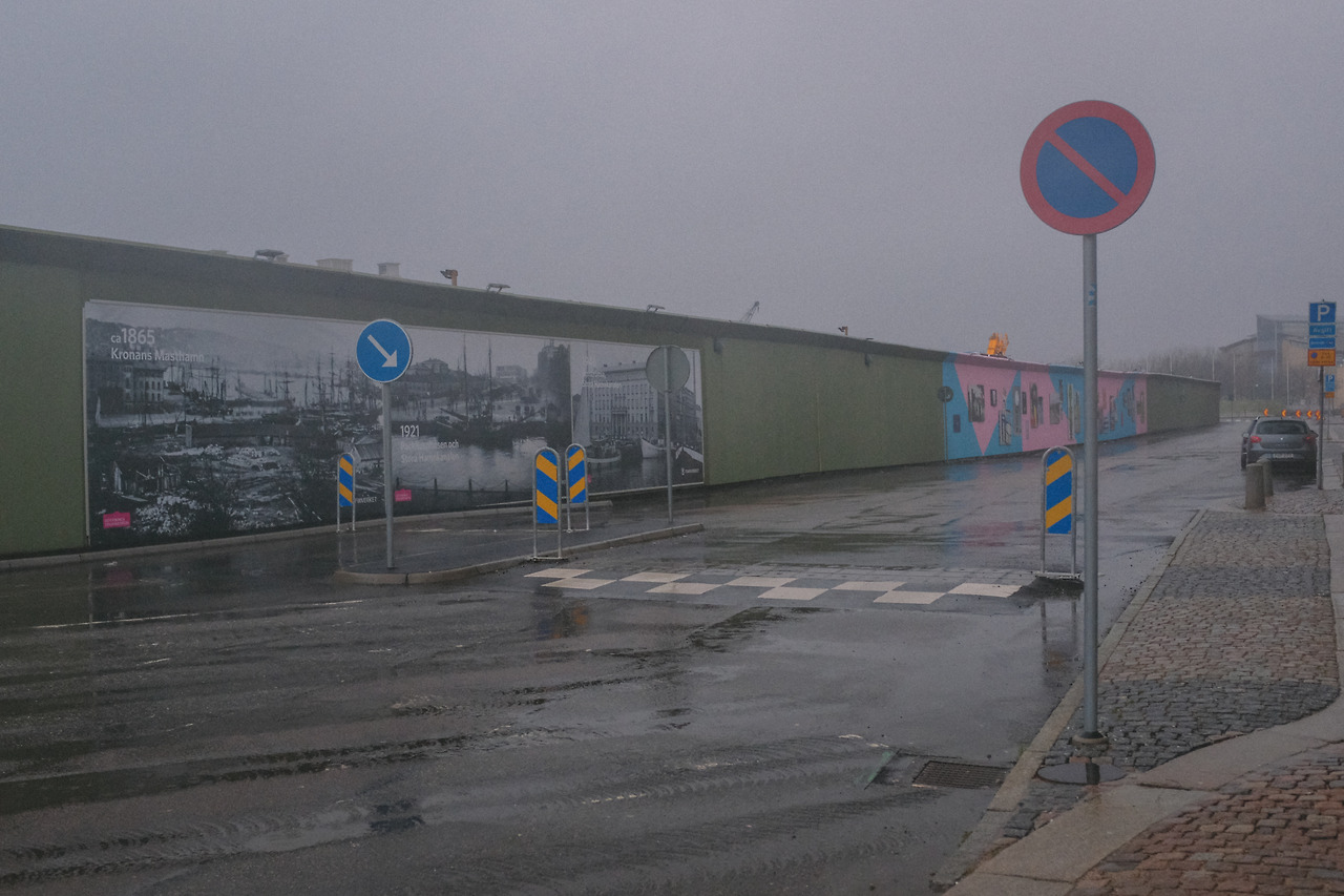 공사장 가림벽으로 볼 수 있는 예테보리의 옛 모습들도, 스웨덴 국기색을 품은 표지판도, 적막한 길을 걷는 내게 소소한 볼거리가 되어주었다.