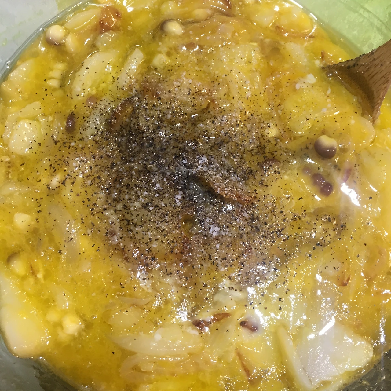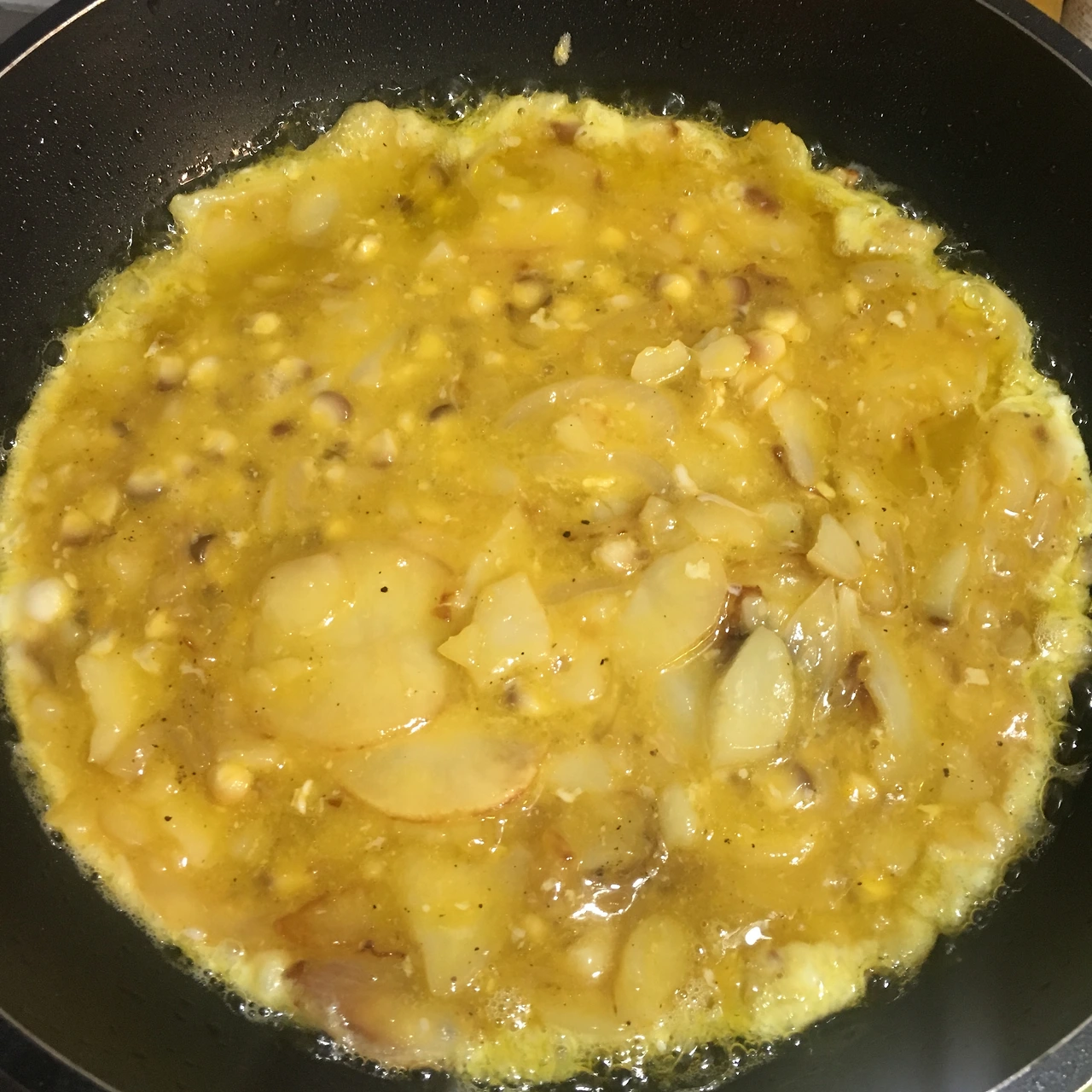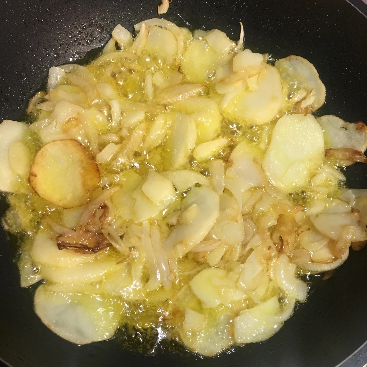 1. 올리브유에 양파와 감자를 황금빛이 날 때까지 약한 불로 튀깁니다.