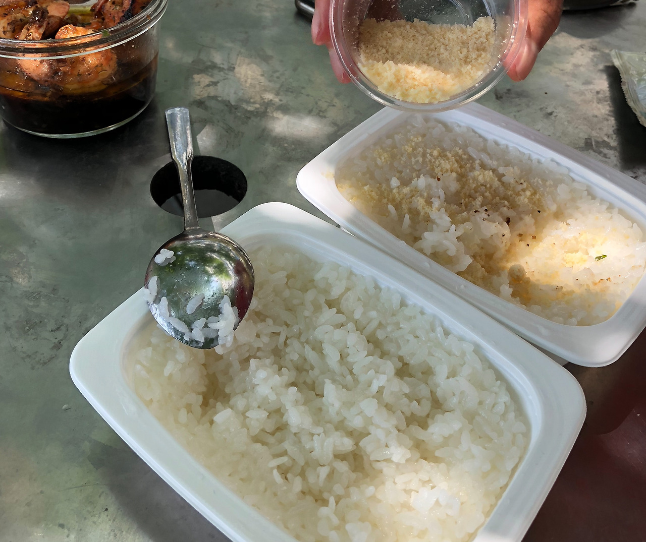 3. 밥 위에 파마산 치즈를 먼저 뿌려준다.