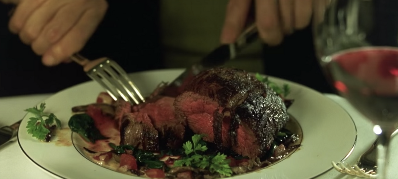 사이퍼는 말합니다. 나도 나의 상태를 알고 있어, 내가 이걸 먹으면 매트릭스가 내 두뇌에서 이걸 즙이 넘치고 맛있다고 느끼게 할 거야. 환상 속 세계에서 그가 먹은 스테이크는 먹음직스럽습니다. 다시 그가 현실에 돌아온 순간 먹는 미네랄 죽과 상반되는 풍족함과 행복함. 그의 환상처럼 우리에게도 스테이크에 대한 환상은 분명 존재합니다.