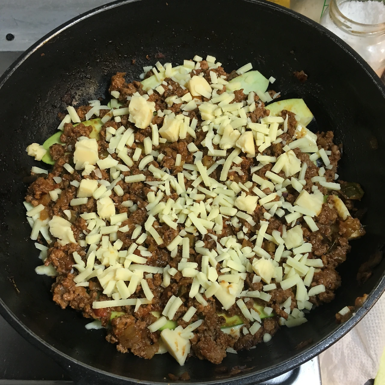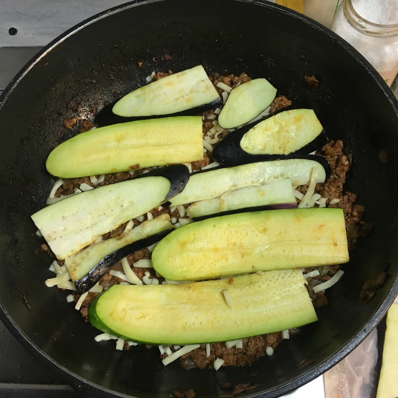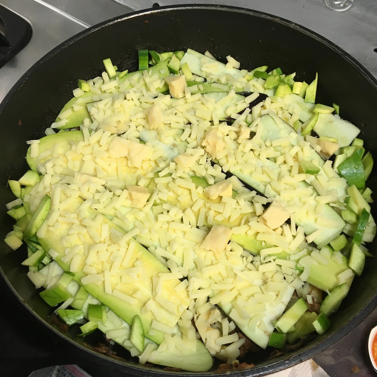 6. 소스-가지, 애호박-치즈 순서로 층을 쌓는다.