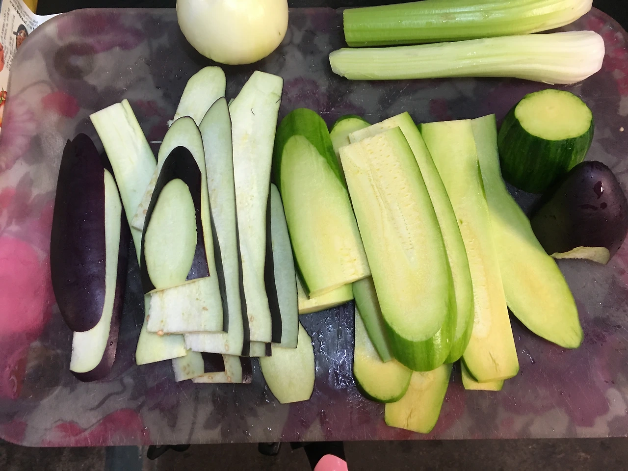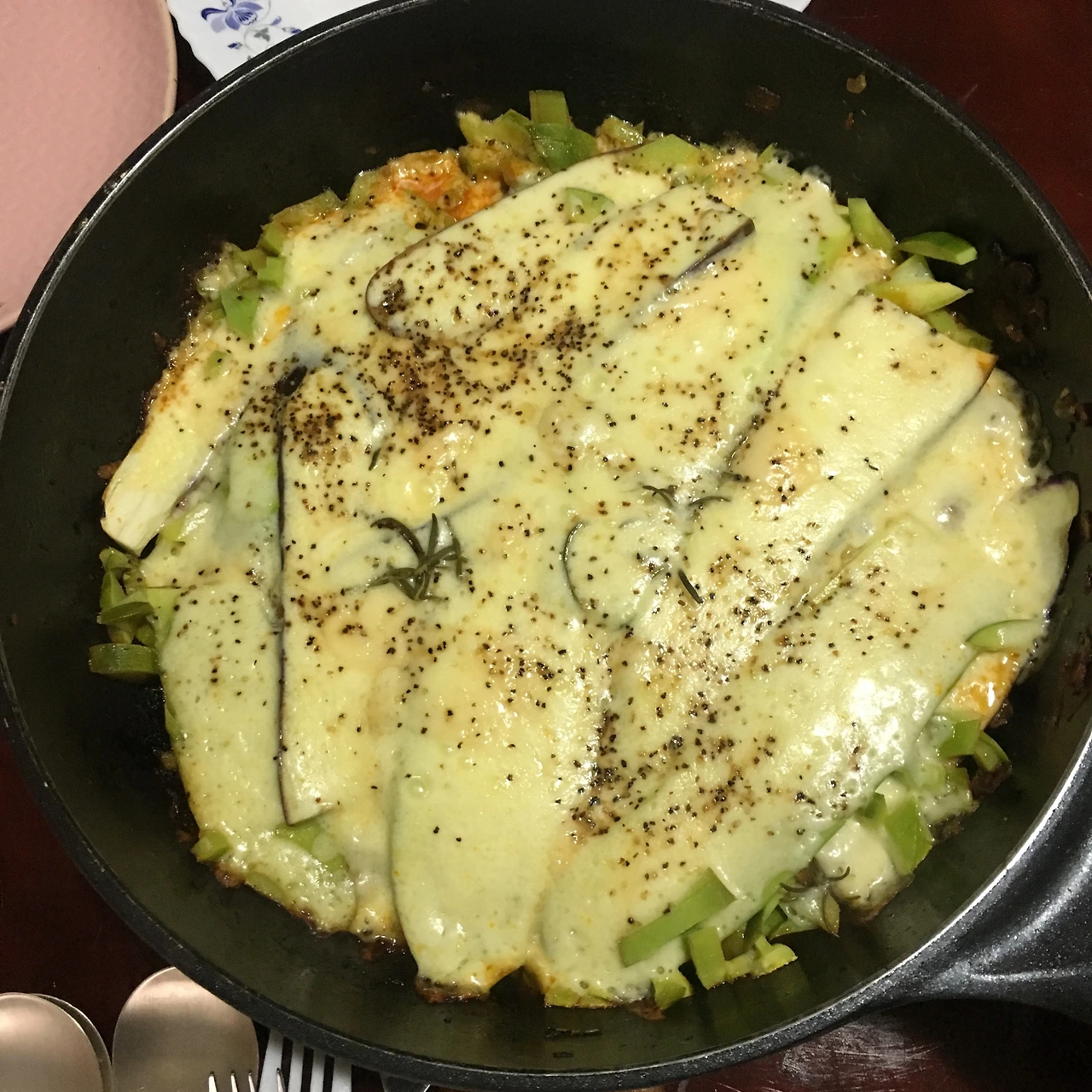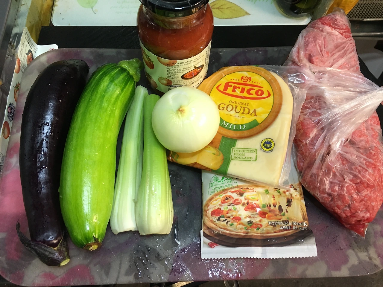 제가 만든 채소 라자냐는 여러 가지가 복합적으로 섞였습니다. 보통 라자냐 파스타를 써야 하지만, 우리 엄마 채소를 맛있게 드시게 하기 위해 '가지'와 '애호박'을 사용했습니다. 얇게 채 썬 채소로 만든 라자냐.