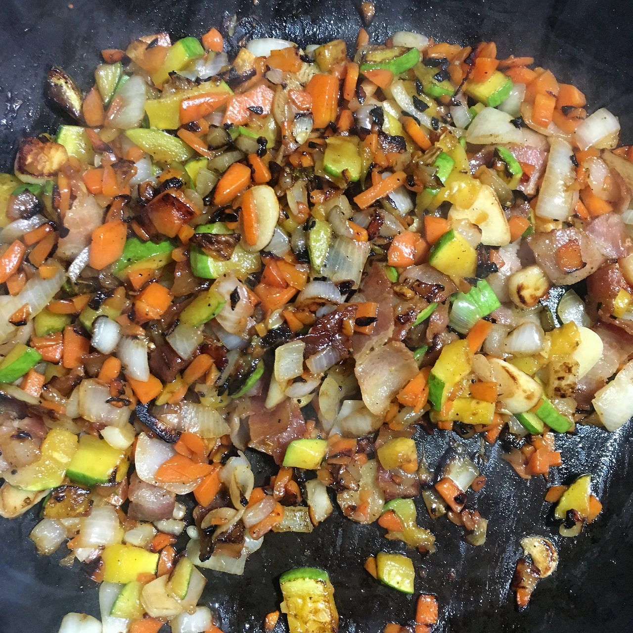 2. 양파, 호박, 당근을 베이컨과 볶습니다