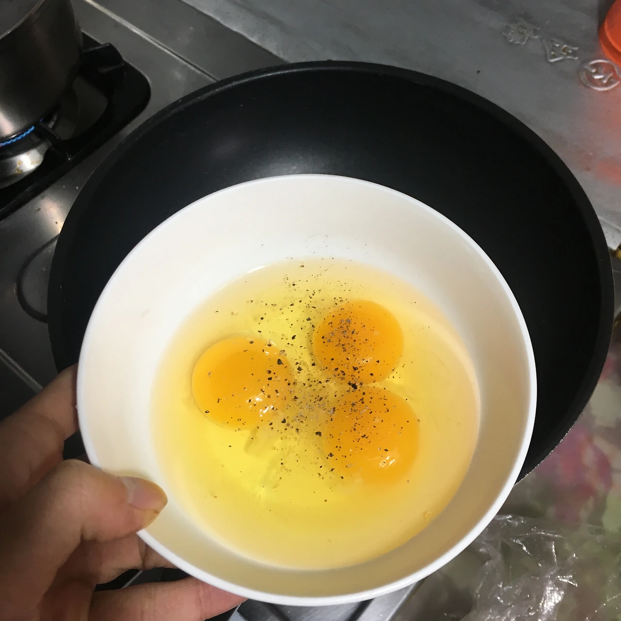 1. 계란 세개에 (소금, 후추) 넣습니다