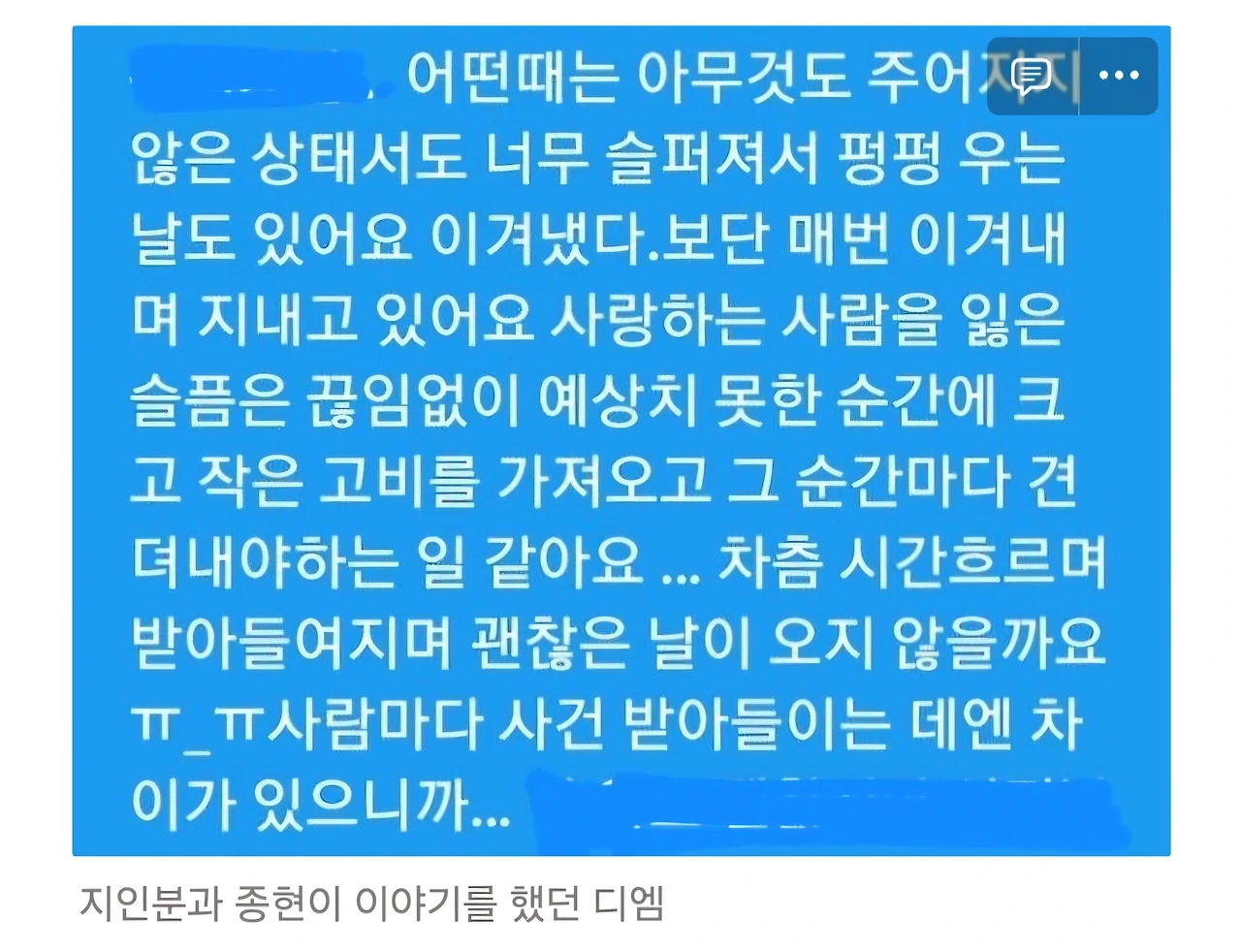 그 일에서 벗어나는 일은 쉽지 않아 지금처럼 담담해지기까지엔 많은 시행착오가 있었어요. 또한 종현이와 무관한 저로써의 삶은 스스로 살아야 했어요. 많이 아팠고, 힘들었고, 누군가의 딸, 언니, 누나로써 또는 친구로서의 역할을 수행하며, 제게 남은 것들을 소중히 했어요.