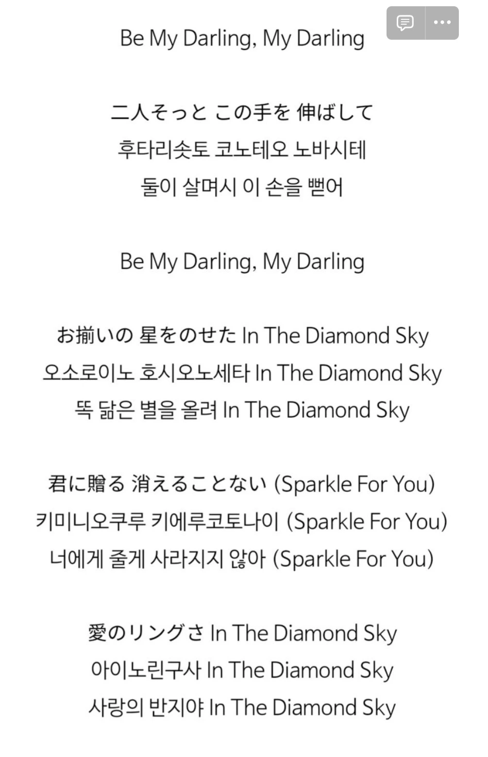 아주 예전에. 한창 슬픔에서 벗어나지 못하던 때에, 저는 유튜브 검색으로 다이아몬드 스카이라는 곡을 알게 되었습니다. 검색에서 가장 맨 위에 떴던 영상은 첫 4인 콘서트에서 네 명이서 다 같이 부르는 무대였어요. 모두가 종현이만을 외치고 보고 있지만, 그래서 더더욱 빈자리만 보게 되었던 기억이 있네요. 음은 힘찼어도, 가사는 하늘에 사랑의 반지를 보내는 내용이었고요.