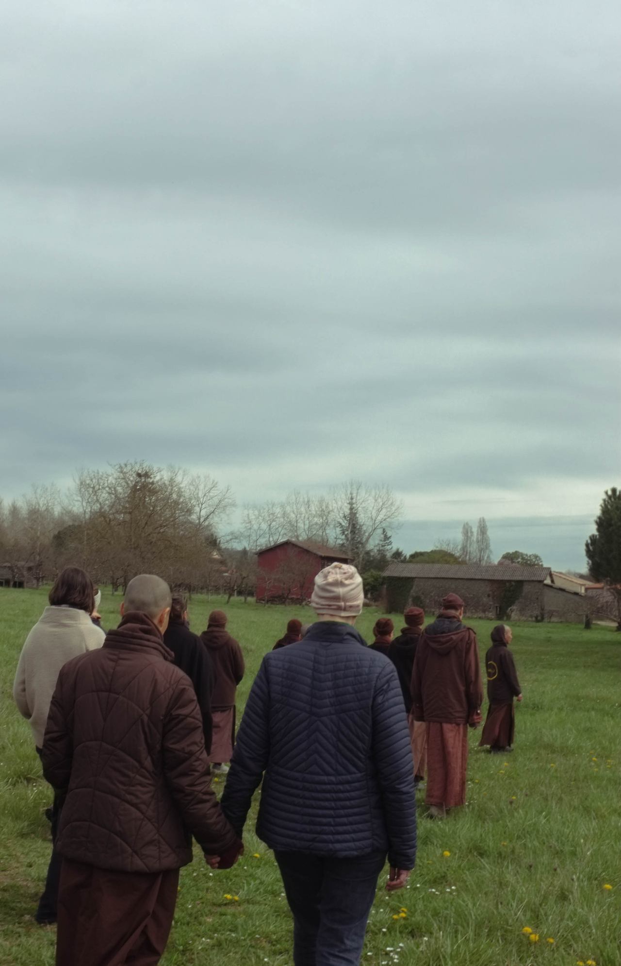 틱낫한 스님은 가만히 앉아서 호흡에 집중하기 어려울 때 특히 걷기 명상을 해보라고 하신다. 마음이 어지럽거나 화가 났을 때는 걷기 명상이 앉아서 하는 것보다 더 도움이 될 수 있다고. 사람들은 마음이 복잡하면 산책을 나가서 생각을 정리하고, 그러면 대부분 마음이 조금은 가벼워져서 집에 오게 되는데, 같은 원리이지 않을까 싶다. 플럼빌리지에서는 점심 먹기 전인 11시에 다이닝 홀 앞에서 모두 원을 그리고 모여 노래를 몇 곡 함께 부르고 나서 걷기 명상을 시작한다.