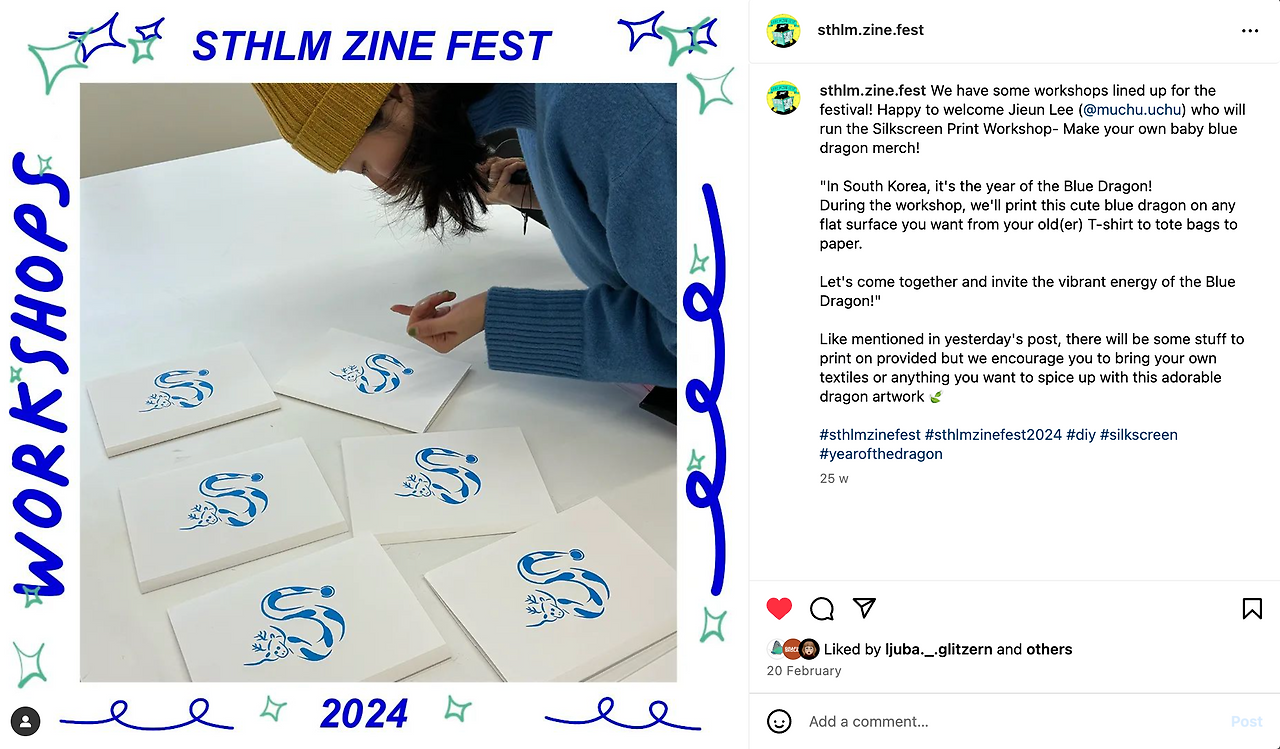 월-금 회사를 다니면서도 계속 딴짓을 꿈꾸고 언젠가는 내 것을 그리고 쓰고 만드는 것이 중심인 삶을 살고 싶다고 생각하던 와중, 2월에 스톡홀름 진 페스티벌 (Stockholm Zine Festival)에 참가해 태어나서 처음으로 만든 그림책을 세상에 내놓았다. 그리고 올해 초 청룡의 해를 맞아 나만의 용을 실크스크린으로 만들어둔 것을 스톡홀름에 가져왔는데 어쩌다가 페스티벌에서 실크스크린 워크샵까지 하게 되었다.