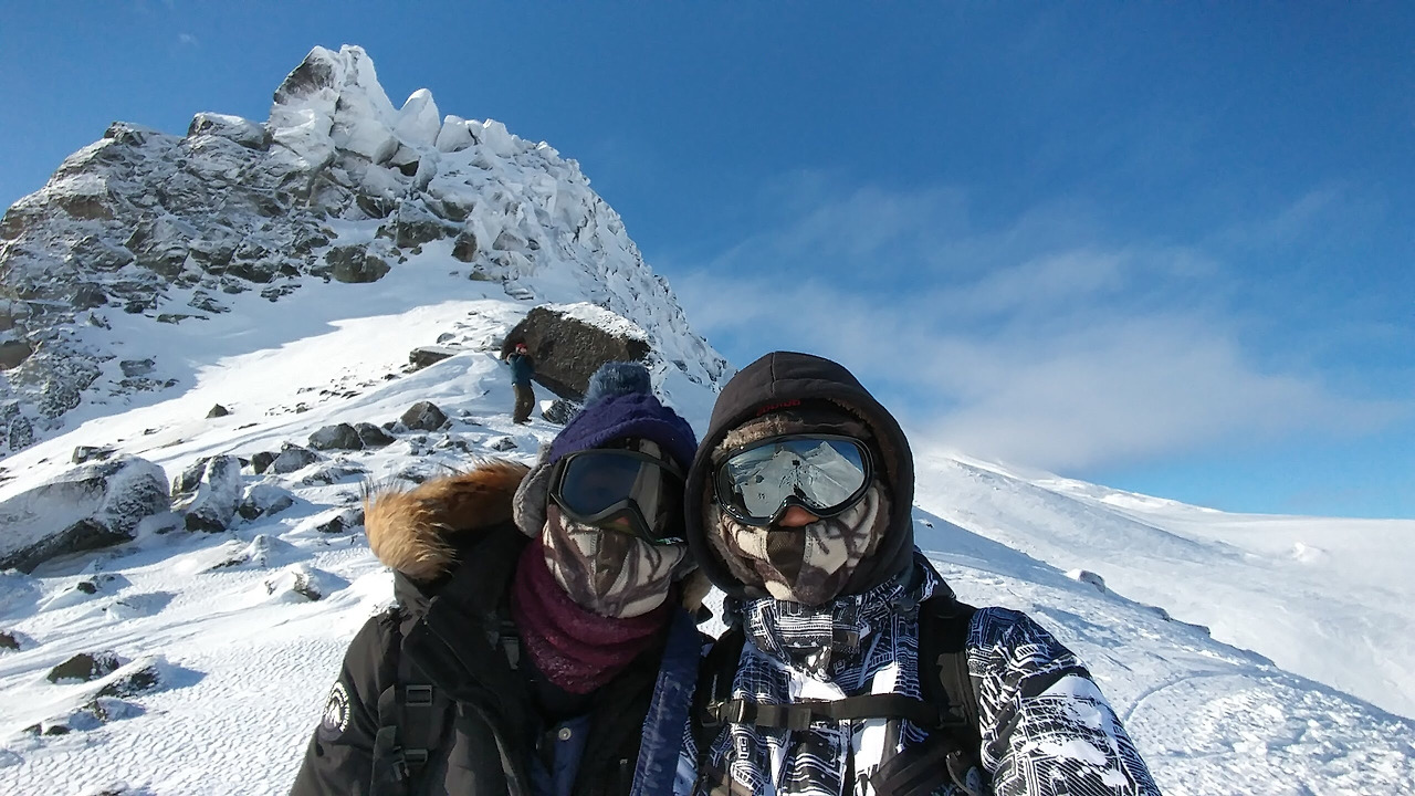끝없이 펼쳐진 눈의 평원, 꼭대기에서는 아직도 뜨거운 김이 나오는 활화산, 눈부신 하늘, 친구들