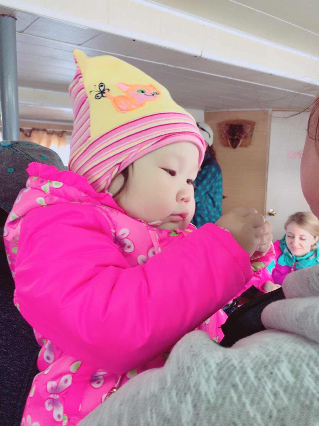 추워서 객실로 들어왔다. 가이드 설명을 듣다가 부랴트족 애기랑 장난치는데 재밌었다. 애기랑 노는건 재밌다. 그 애기한테 어머니분 몰래 내가 웃긴 표정을 지으니까 (아님 그냥 웃기게 생겨서 그런걸 수도) 깔깔거리며 날 때렸다. 여튼 곧 우리는 수르하이타에 도착했다.