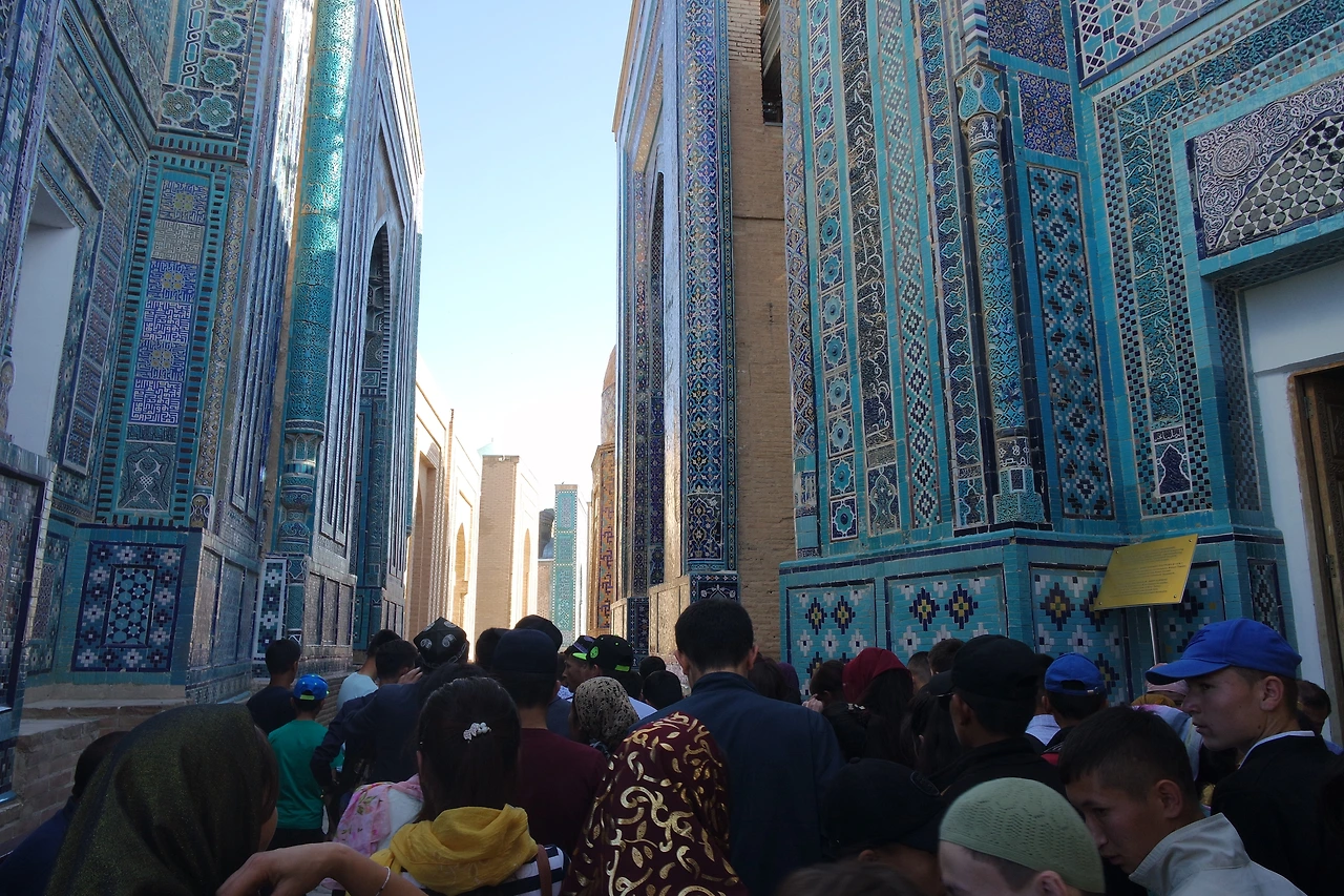 아무튼 시장을 나와 동쪽으로 조금 걸어가면 샤히진다가 나온다. 샤히진다는 사마르칸트의 네크로폴리스로, ‘살아있는 왕’이라는 뜻이라고 한다. 샤히진다에 도착하니 이미 사람들은 바글바글 했다. 이때가 아침 9시가 안 되었을 때였다. 여기서 돌아다니면 모든 이의 시선을 한 몸에 받는다. 특히 샤히진다는 단체관광객으로 그 좁은 길에 성수기 명동거리 이상이었다.