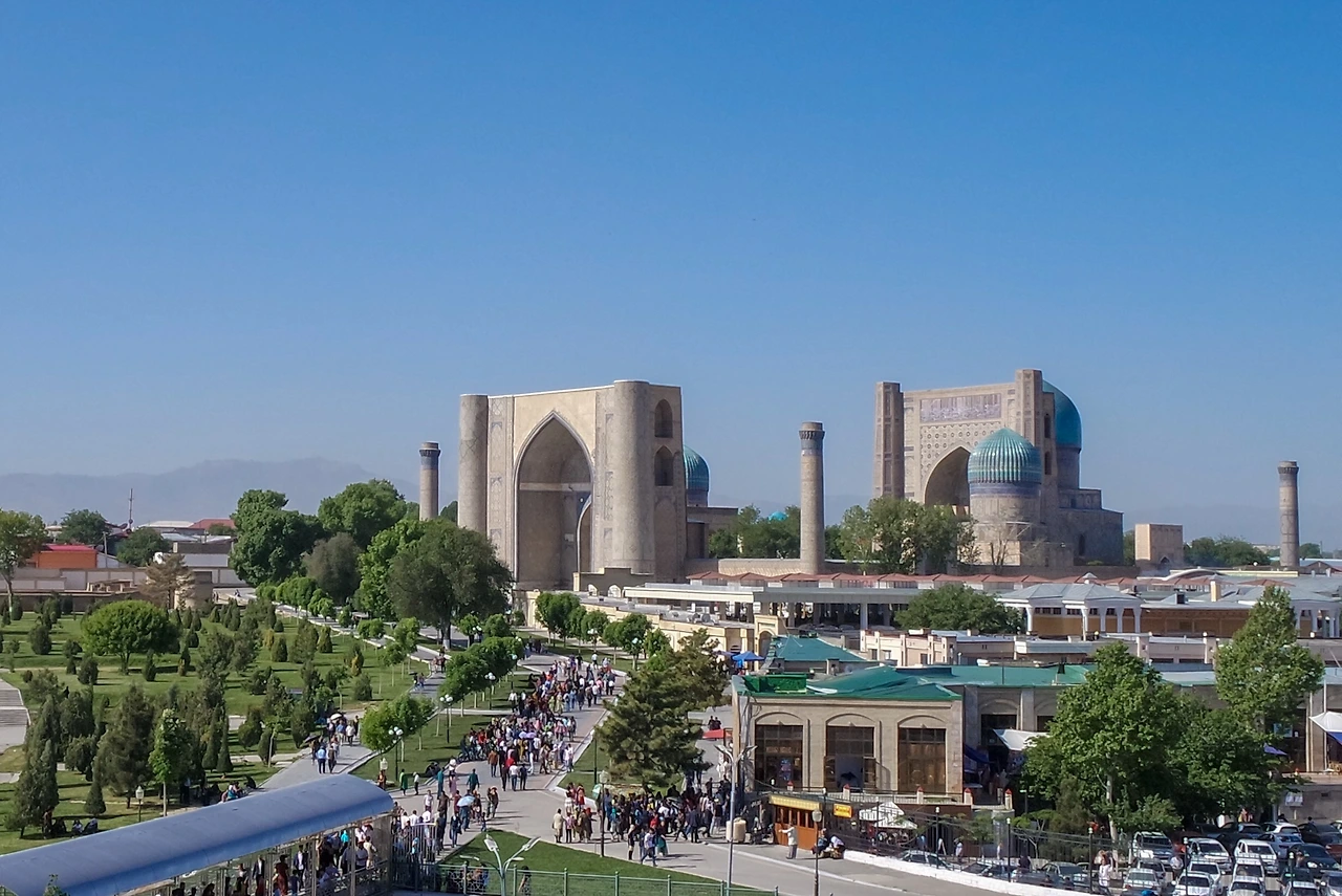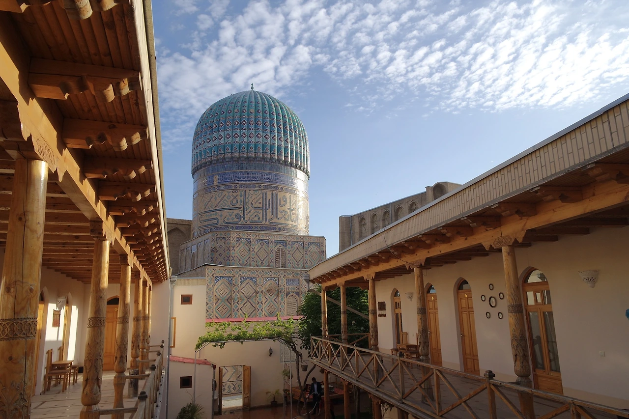 레기스탄의 뒤쪽으로 쭉 걸어가면 잘 꾸며진 도로로 기념품 상점들이 나 있고, 그 도로는 곧 비비하눔 모스크로 이어진다.