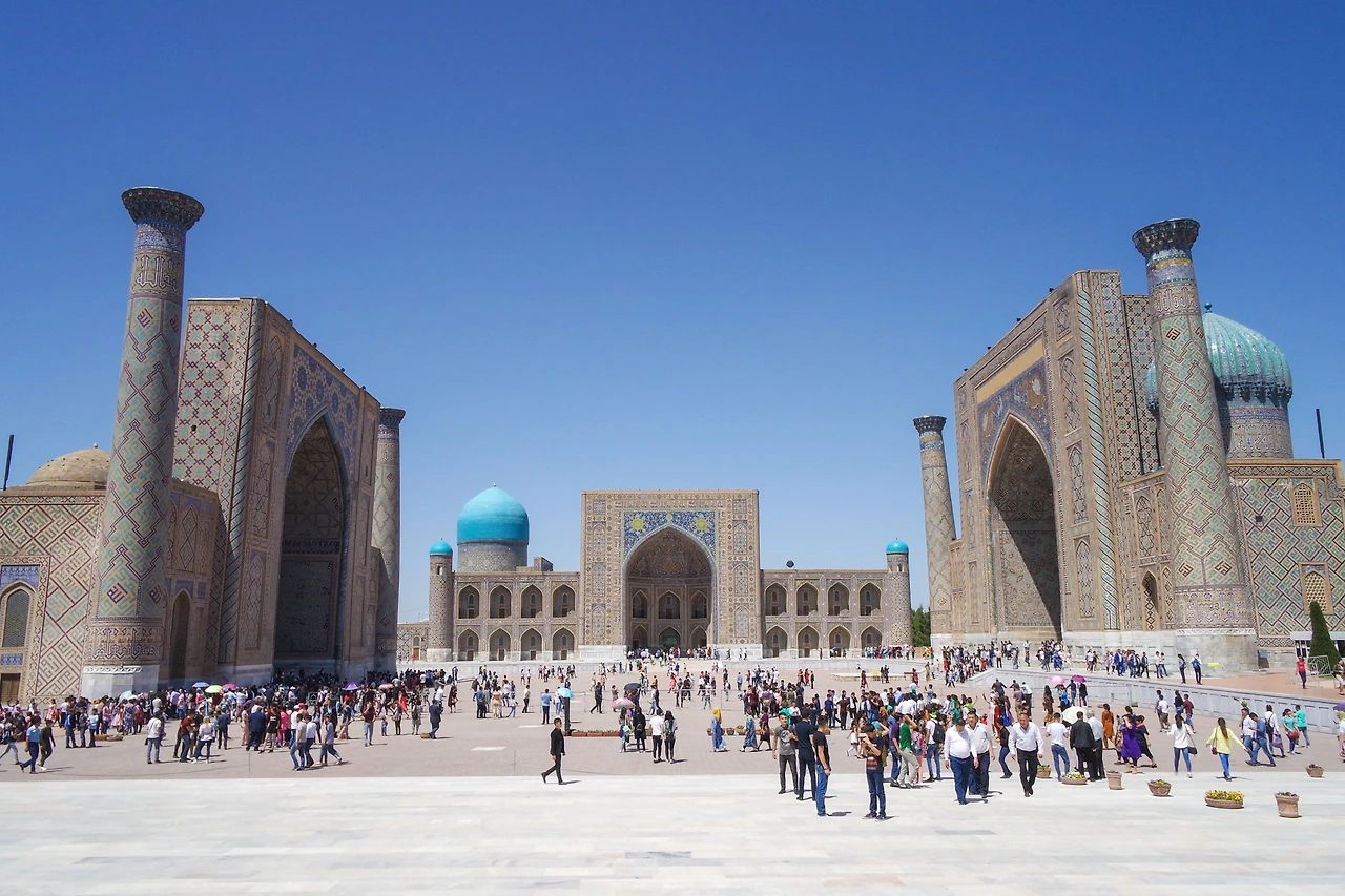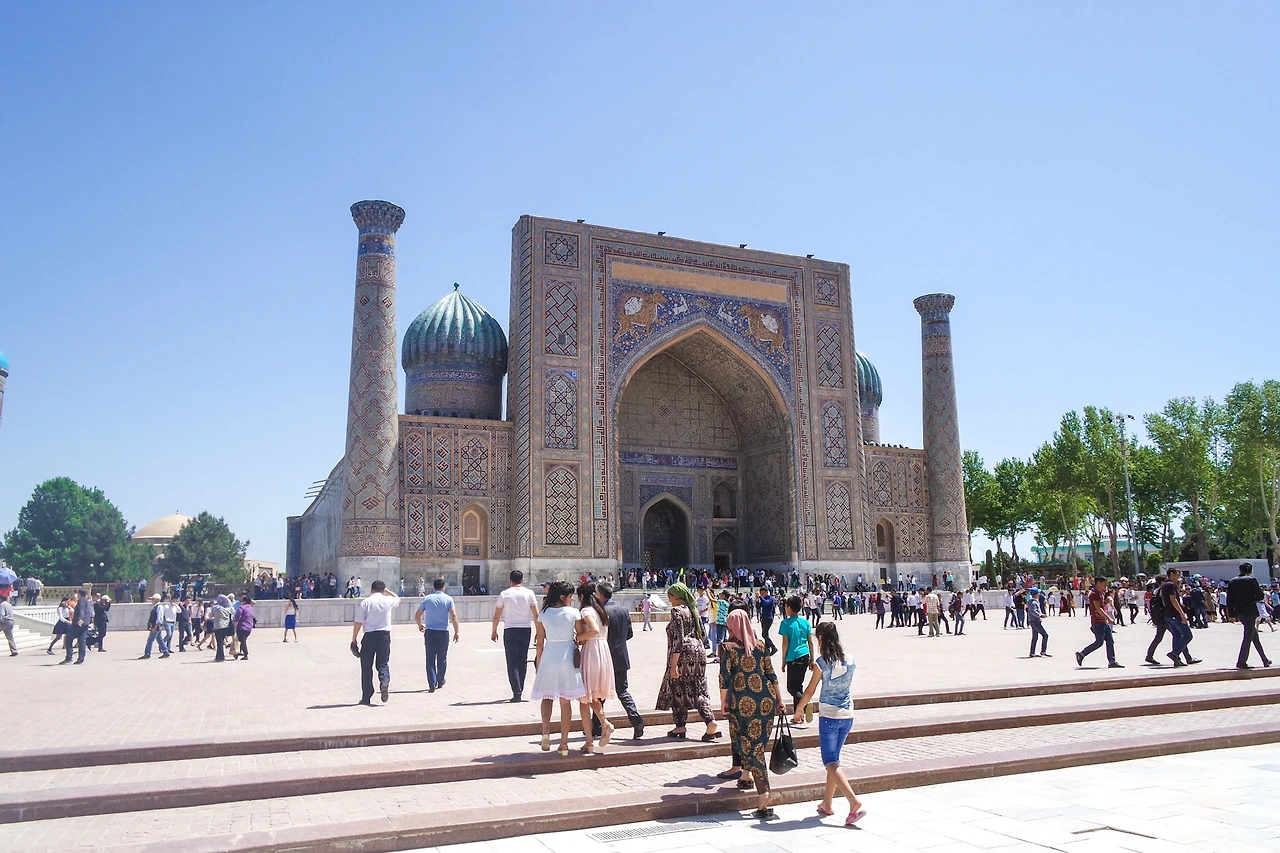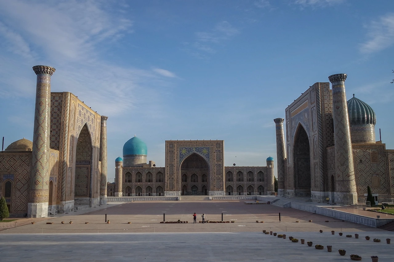 구석으로 살짝 돌아가긴 했지만 오히려 새로운 광경을 보면서 레기스탄 광장에 도착했다. 아직 문을 열지 않아 광장에 사람은 없었다. 레기스탄은 페르시아어로 ‘모래의 땅’이라는 뜻이다. 광장을 이루고 있는 울루그벡 마드라사, 틸랴 코리 마드라사, 쉐르다르 마드라사는 각각의 건물만 떼어놓고 보면 그냥 보존이 잘 된 우즈벡의 마드라사(신학교)이지만, 그 세 건물이 한 광장에 모여 앙상블을 이루니 알 수 없는 어마어마한 기운이 쏟아져 나왔다.