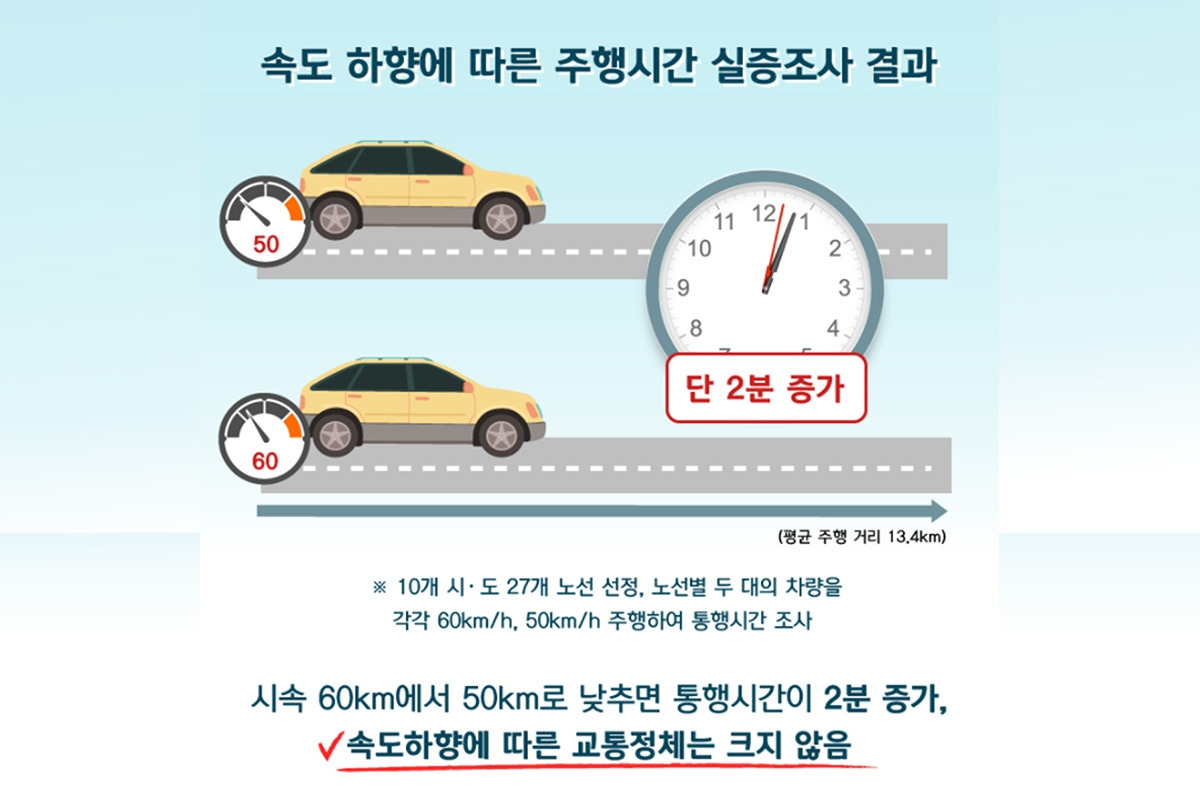 게다가 제한 속도를 낮춤으로 인한 통행 불편도 크지 않다는 설명이다. 한국교통안전공단의 조사 결과에 따르면, 도시 내 도로에서 제한 속도를 10km/h 낮춤으로써 늘어나는 통행 시간은 2분에 불과하다고 한다. 제한 속도를 낮춤으로써 발생하는 교통 정체 현상은 미비할 것이라는 설명이다.