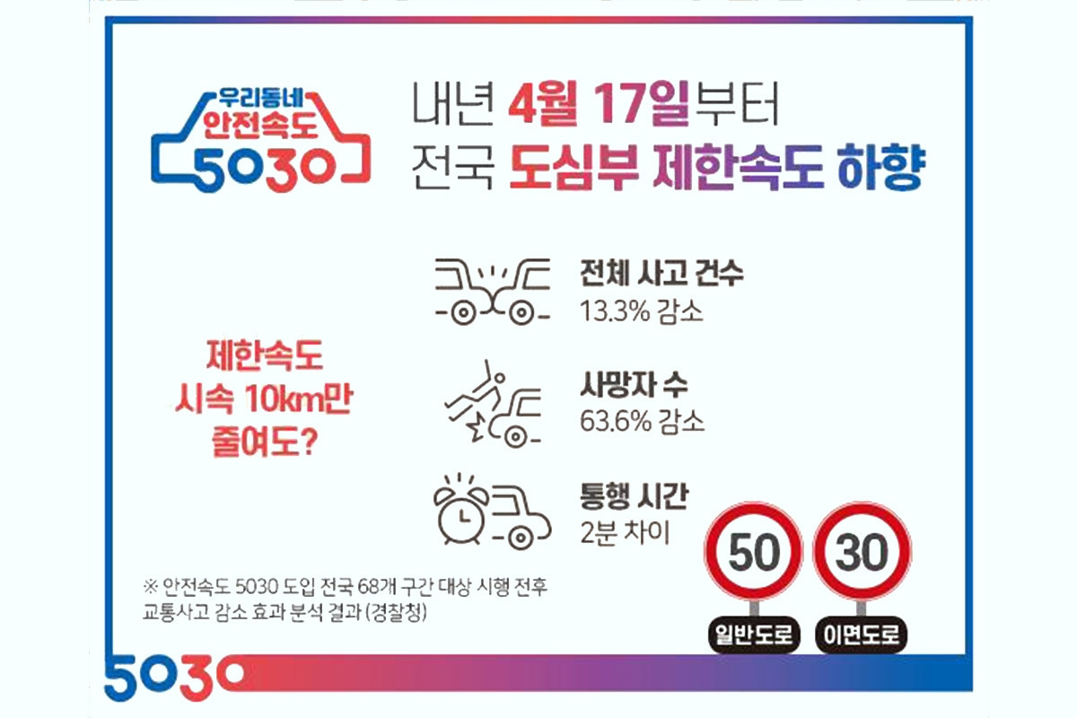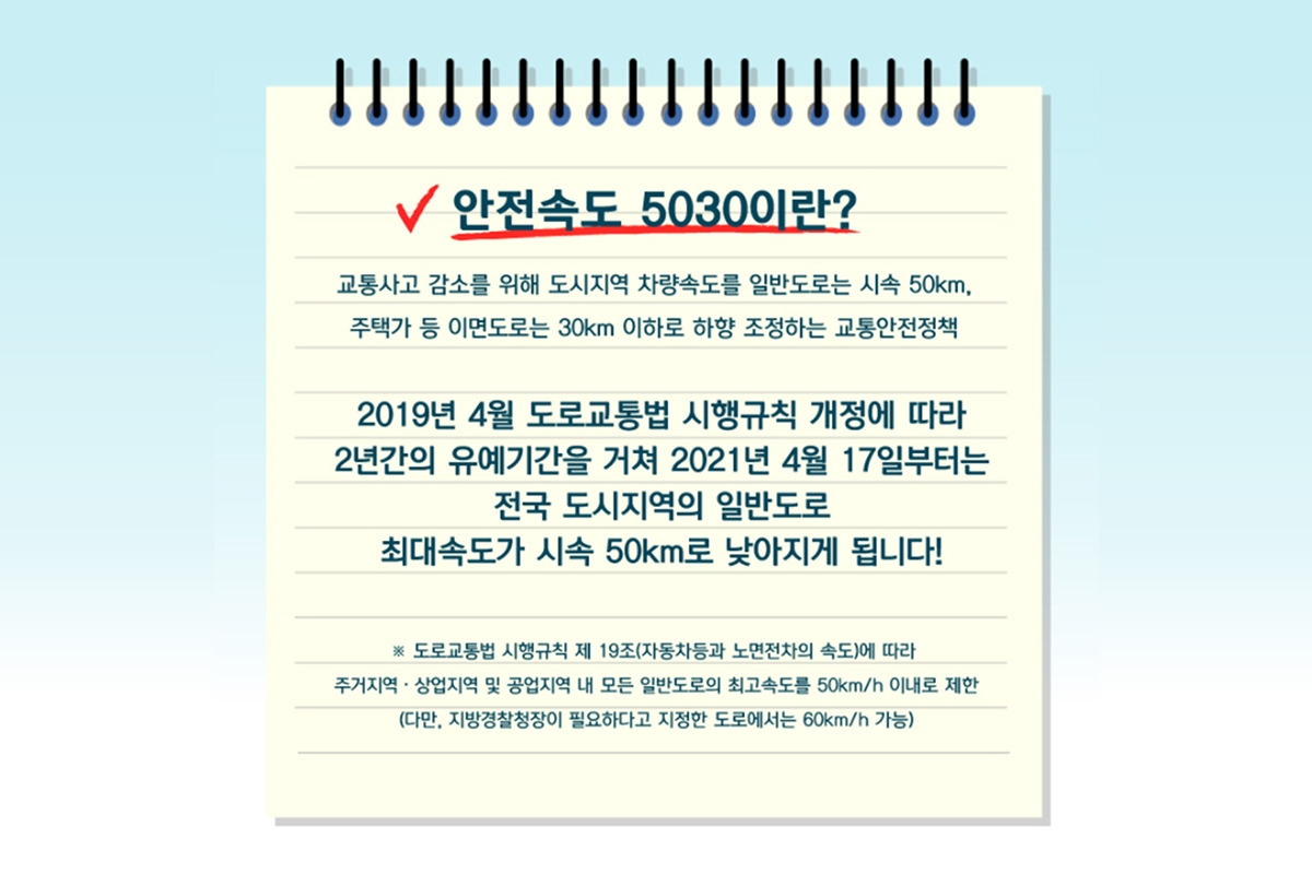 이후 2019년 4월, 도로교통법 시행 규칙이 개정되면서 전국 곳곳에선 일반 도로의 제한 속도를 50km/h로 낮추는 등 변화된 제한 속도 규정을 적용하기 시작했다. 이 제도는 2년의 유예기간 동안 전국적으로 확대될 예정이며, 2021년 4월 17일엔 전국 도시지역 일반 도로 최대 속도가 50km/h로 낮아지게 된다.