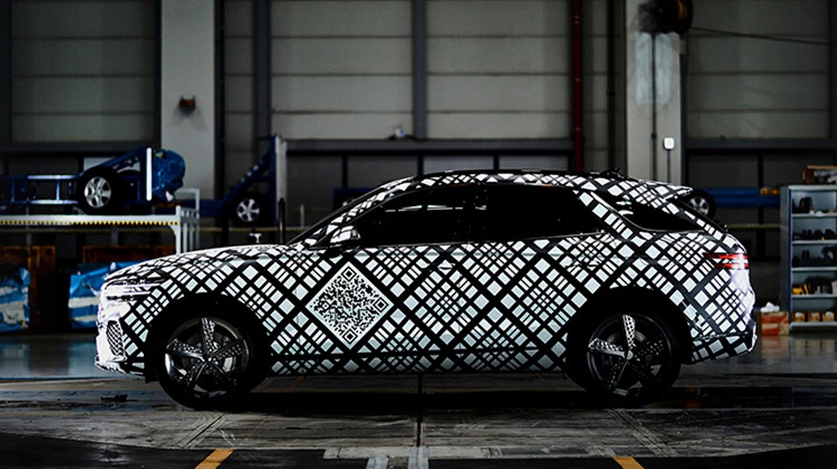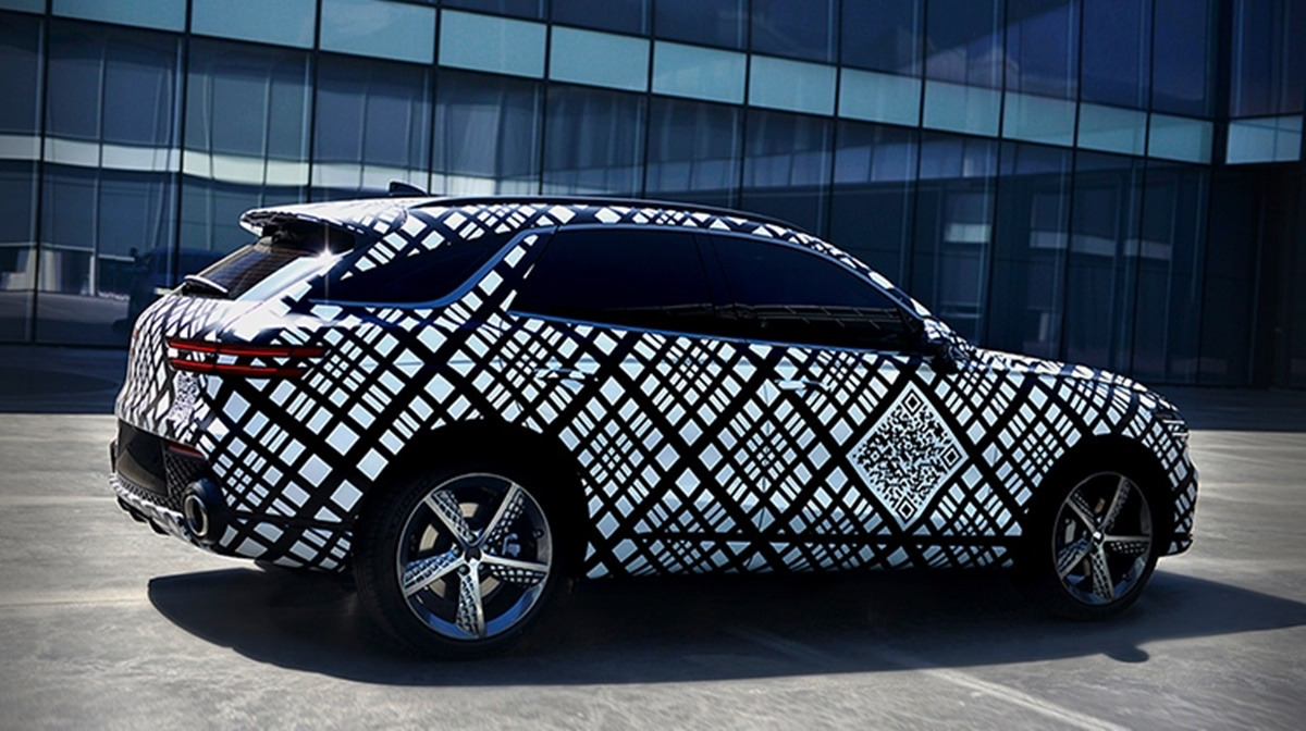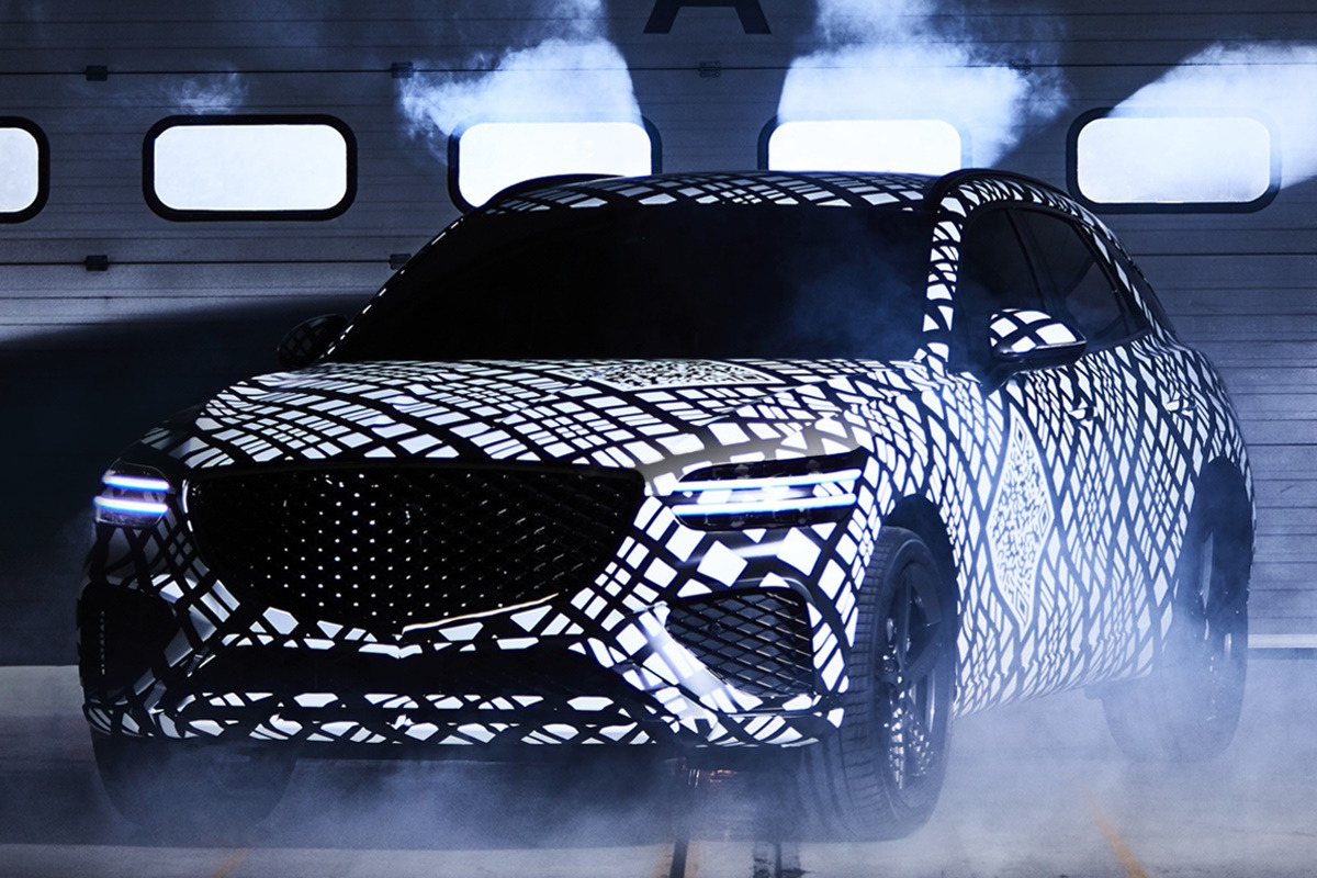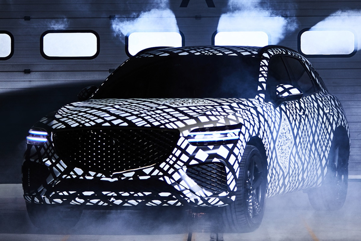 제네시스는 지난 9월 29일, 위장막으로 감싸진 신형 GV70의 외관 디자인을 공개했다. 이번 GV70의 디자인 공개에는 카무플라주 패턴을 적용한 위장막이 사용되었다. 이는 신차의 디자인을 숨기면서도 특징을 부각시켜 기대감을 높이는 기법으로, 이번 GV70 디자인 공개에 처음으로 사용되었다. 카무플라주와 더불어 GV70의 디자인 컨셉이 될 G-Matrix 패턴도 위장막에 적용되었다.