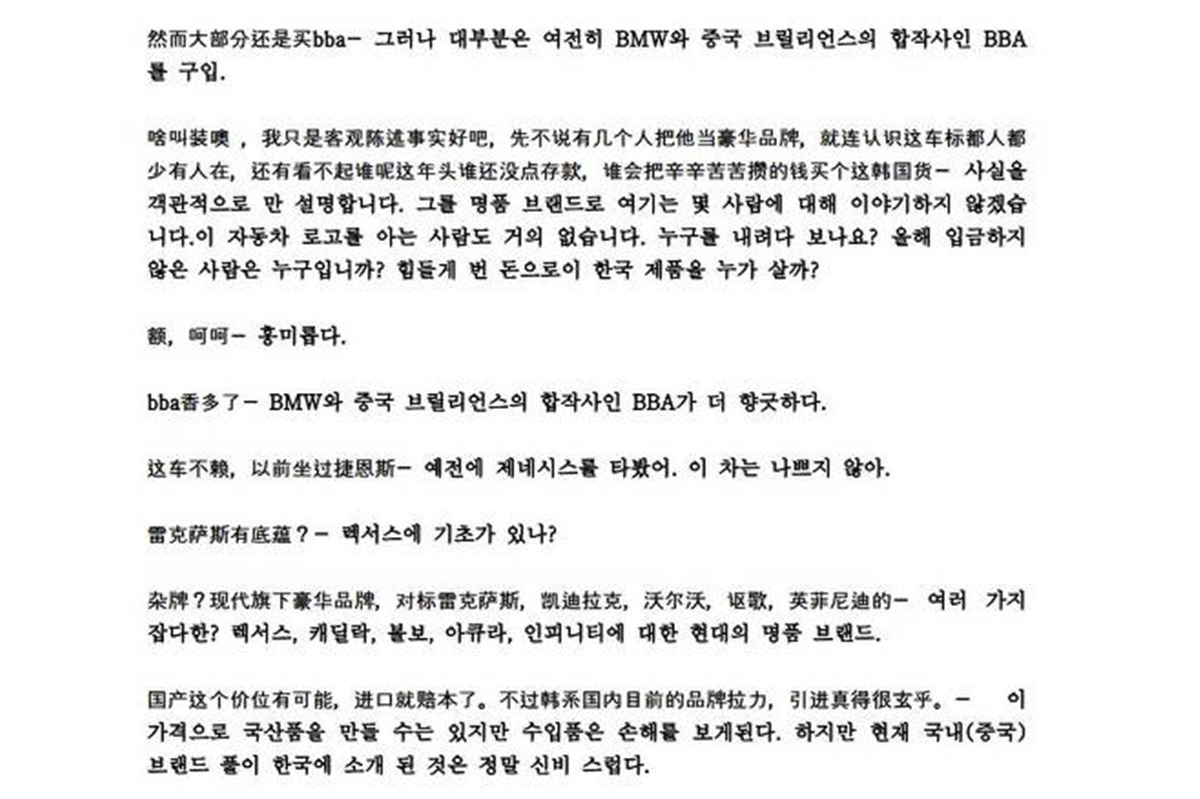 또한 “독일까지는 아니더라도 제네시스 정도면 중국에서 욕먹을 수준은 아니다”, “너네가 아직 현대기아차를 욕할 수 있는 수준이 아니다”등 국내 기술력이 중국보다 낫다는 반응이 대부분이었다. 그밖에 중국 네티즌들의 브랜드에 대한 비난에도 “중국이나 일본한테 욕먹는 건 참을 수 없다”, “욕해도 우리가 욕한다” 등의 반응을 보였다.