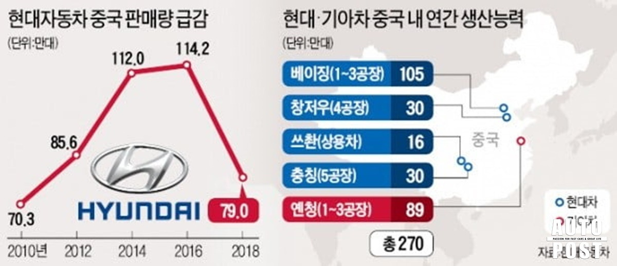 2002년, 중국의 베이징 자동차와 합작한 현대차는 중국 시장에서 괄목할만한 성장을 보였다. 중국 내 자동차 합작 회사 중 가장 빠른 기간에 천만 대라는 누적 판매량을 기록하기도 했다. 이후 중국 대륙에 공장을 설립하여 생산/공급 인프라를 확장하는 등 중국 시장에서 현대차는 꽃길을 걷는 듯했다. 하지만 이러한 현대차의 상승세는 최근 급격히 꺾이고 있다.