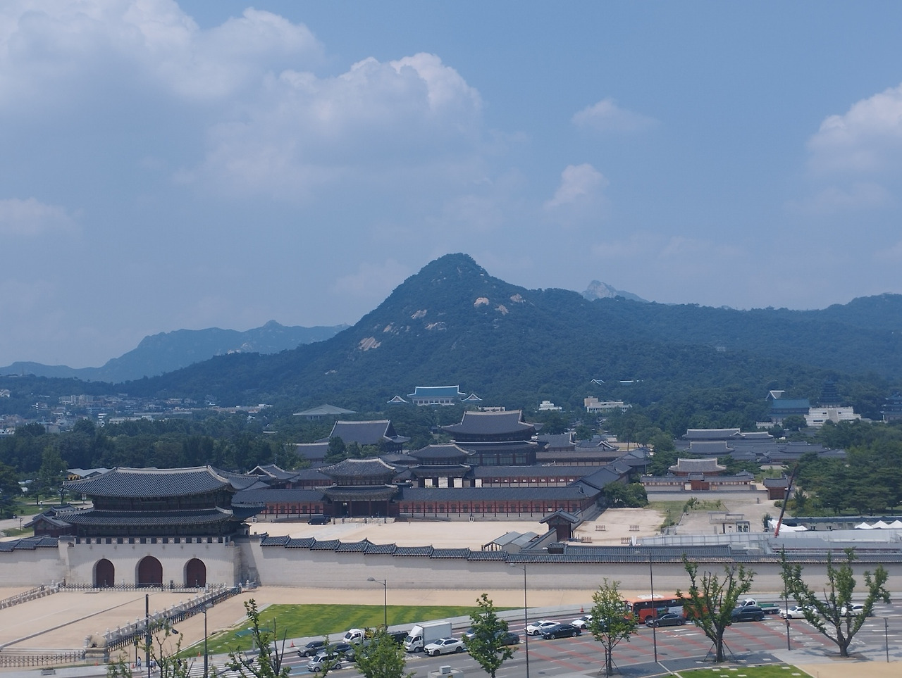 한여름 더위를 피하여 간 대한민국 역사박물관 8층 옥상 정원에서 놀라운 광경을 봤다. 사진을 잘 찍지는 못 하지만 사진을 찍지 않을 수 없었다. 광화문 –경복궁- 청와대- 그리고 북악산이 한 줄에 늘어선 것이 실로 장관이었다.