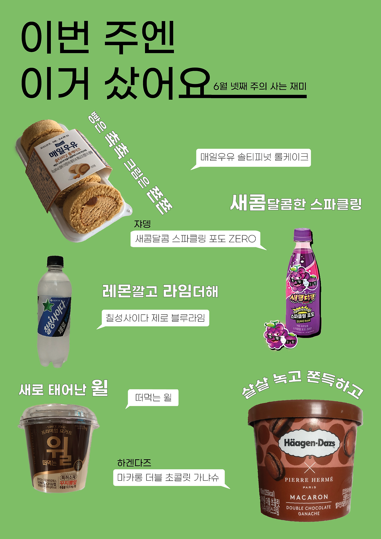 어느새 6월도 막바지입니다. 저는 편의점 산책에 푹 빠졌고요. 친구와 편의점에서 음료나 아이스크림을 사들고 동네 한 바퀴 돌 때마다 그렇게 행복할 수가 없어요. 덕분에 요즘은 주로 편의점에서 장을 보고 있습니다.