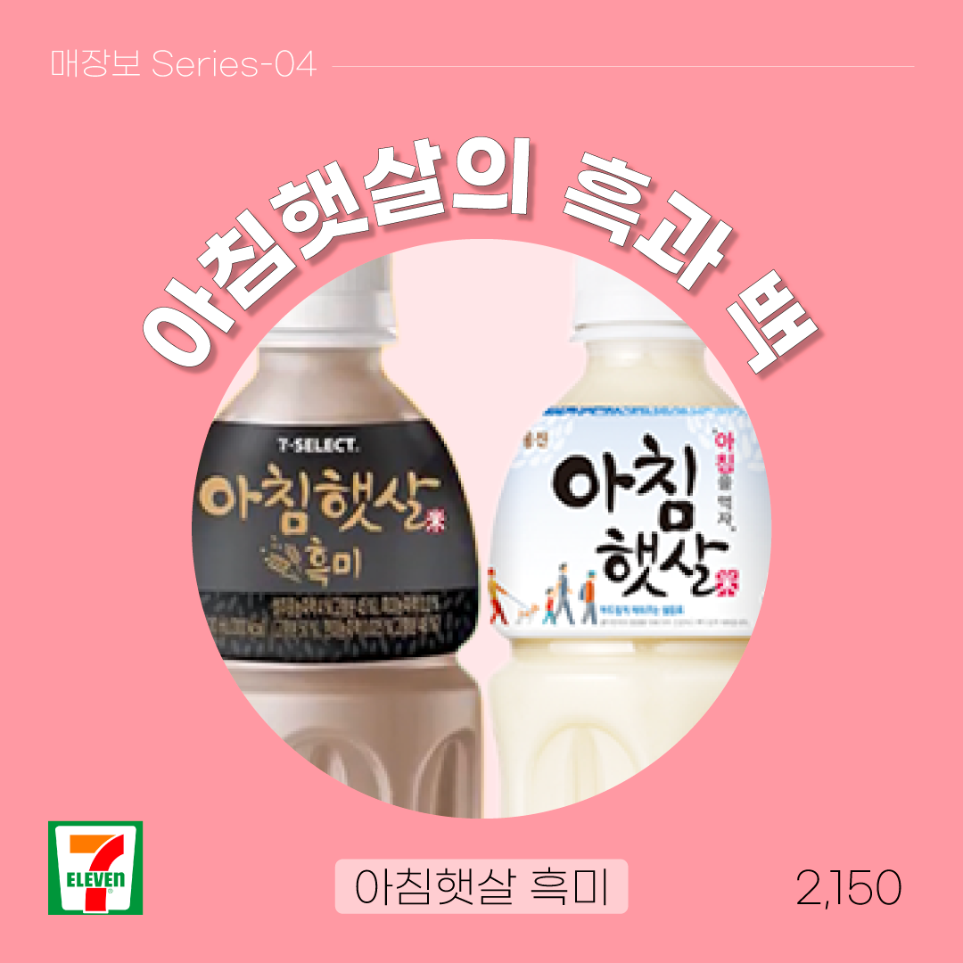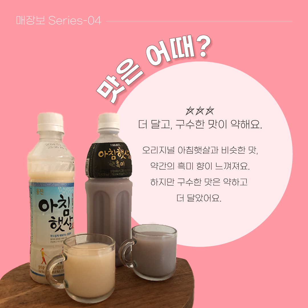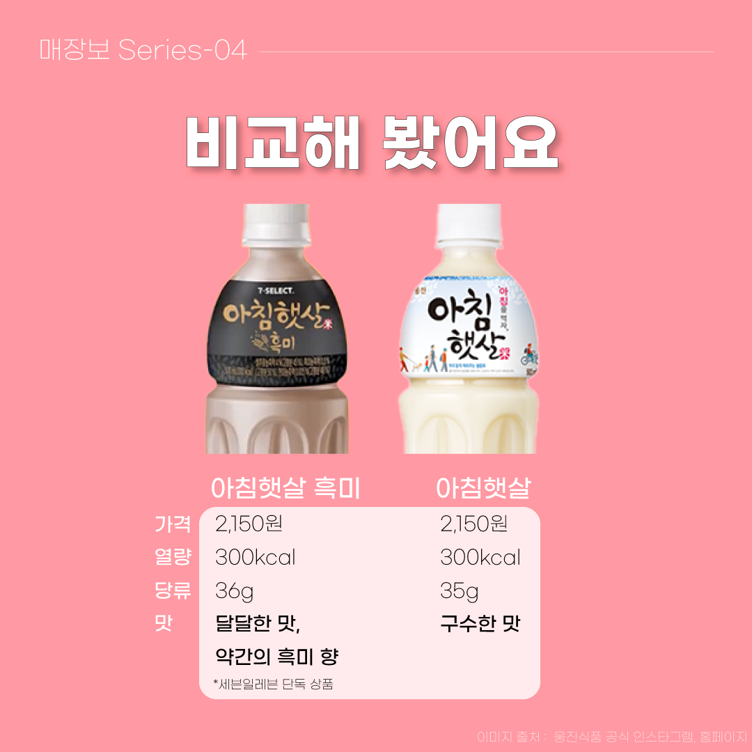 겉모습은 흑과 백으로 차이가 명확하지만, 맛도 비슷하고, 칼로리와 가격은 동일합니다. (용량 500mL, 판매처 세븐일레븐 기준) 아침햇살 흑미는 맛은 괜찮았던 제품이지만, 흑미만의 고소함은 느낄 수 없어 조금 아쉬운 제품이었습니다. 하지만, 좋아하는 제품의 새로운 버전을 경험하는 것만으로도 충분히 즐거운 시간이었습니다. 아침햇살 좋아하시는 분들은 한 번 드셔보세요!