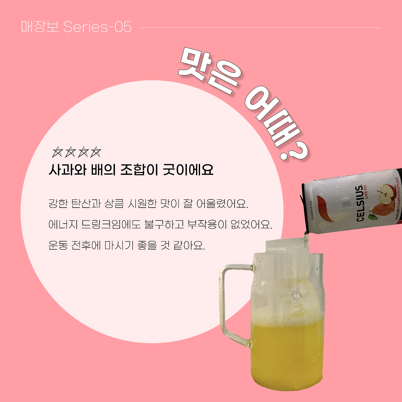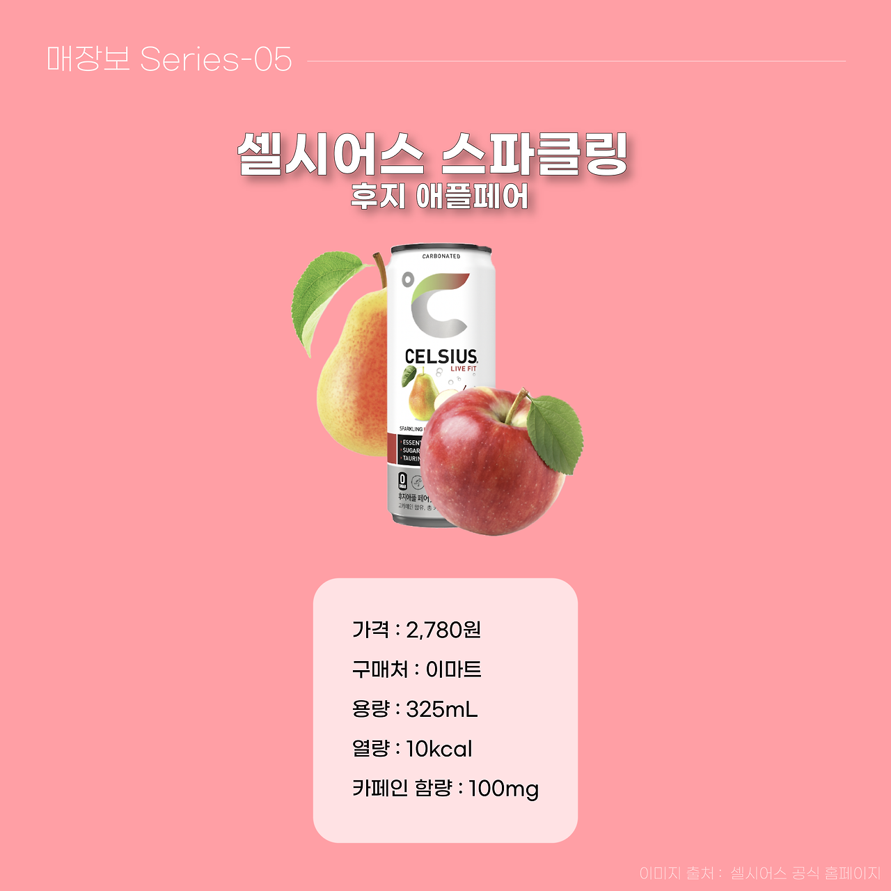 이 음료는 저의 최애 유튜버, 엠마 챔벌린의 브이로그를 보다가 발견한 제품입니다. 구독자 1200만의 어마어마 한 셀럽인 엠마는 규칙적인 생활과 운동을 통해 부지런히 자기 관리를 하는 것으로 유명한데요. 저는 그녀가 헬스장 가는 길에 즐겨 마시는 이 캔음료가 눈에 띄었습니다. 정말 자주 등장해서, 이젠 제품명까지 외워버렸어요. 셀시어스. 자기 관리도 잘하고, 물건 고르는 안목도 좋기로 유명한 그녀가 마시는 음료는 어떤 제품일지 정말 궁금했습니다. 근데, 거짓말처럼 이마트 음료코너에 이 제품이 떡하니 있더라고요. 마음속으로 ‘엠마가 마시던 거다!’ 외치며 기쁜 마음으로 구매했습니다.