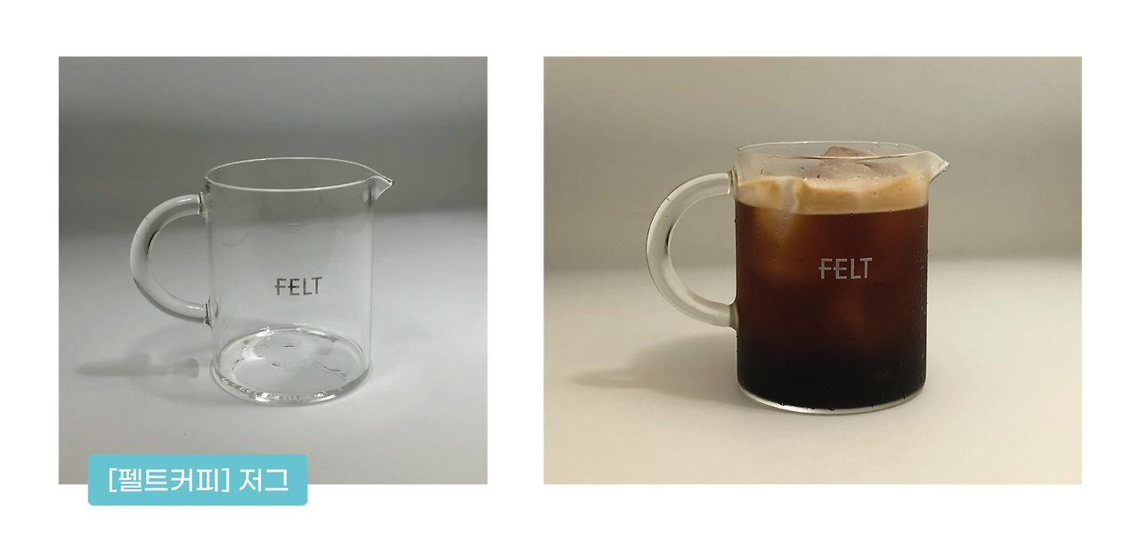 한국의 카페브랜드, 펠트커피의 로고가 새겨진 커피 저그입니다. 제조사는 일본의 테이블웨어 브랜드인 킨토예요. 본래 드립커피를 내릴 때 사용하는 서버이지만, 잔으로 사용하기에도 손색이 없습니다. 일단 비커를 연상케 하는 귀여운 모양에. 용량도 약 500mL로 충분하구요. 입구가 넓고, 300mL 안내선이 있어 드립백을 내리기에도 편리했어요.
